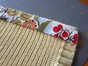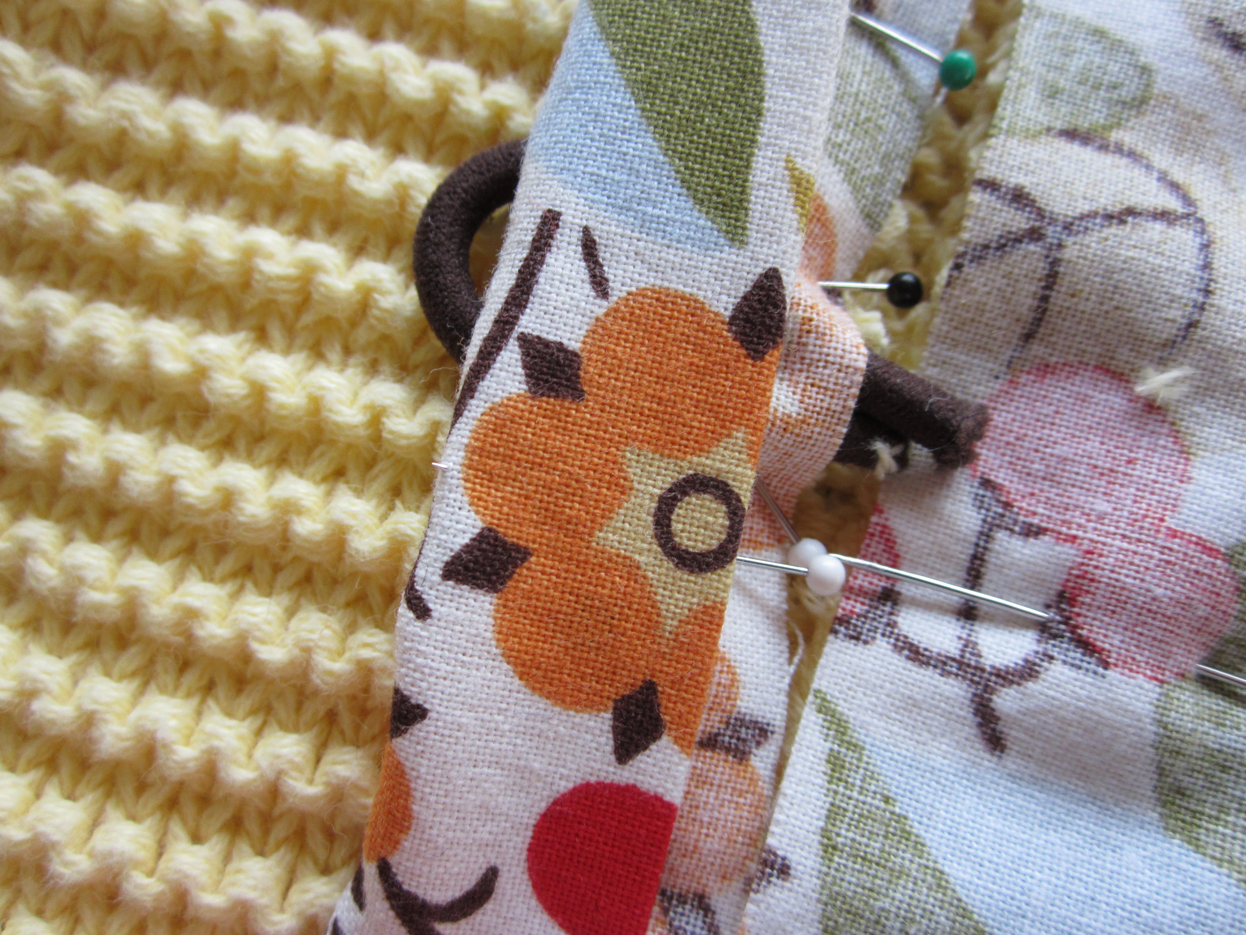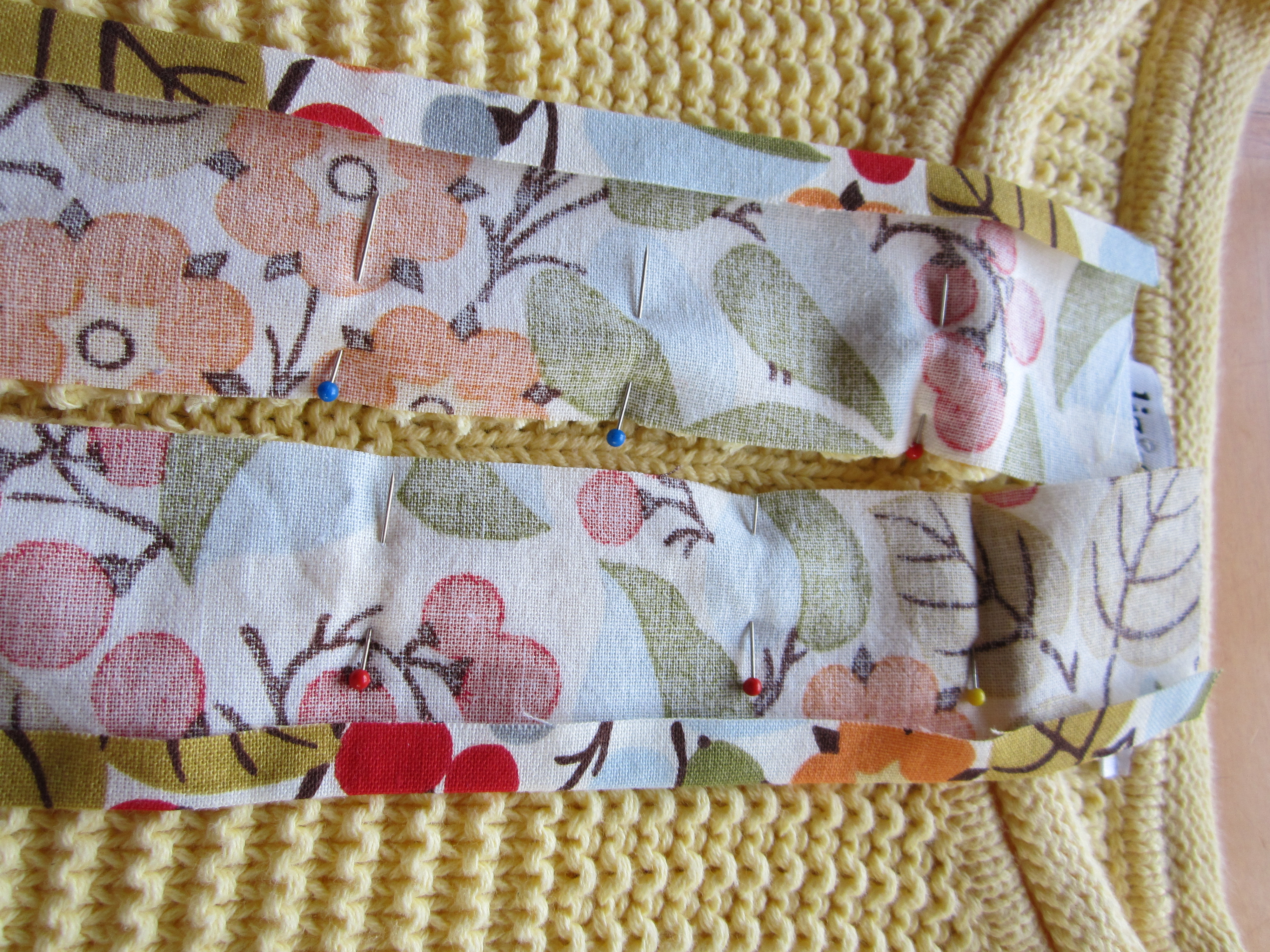 After pressing under one side of the strips of fabric, I pinned it to the sweater right sides together.
