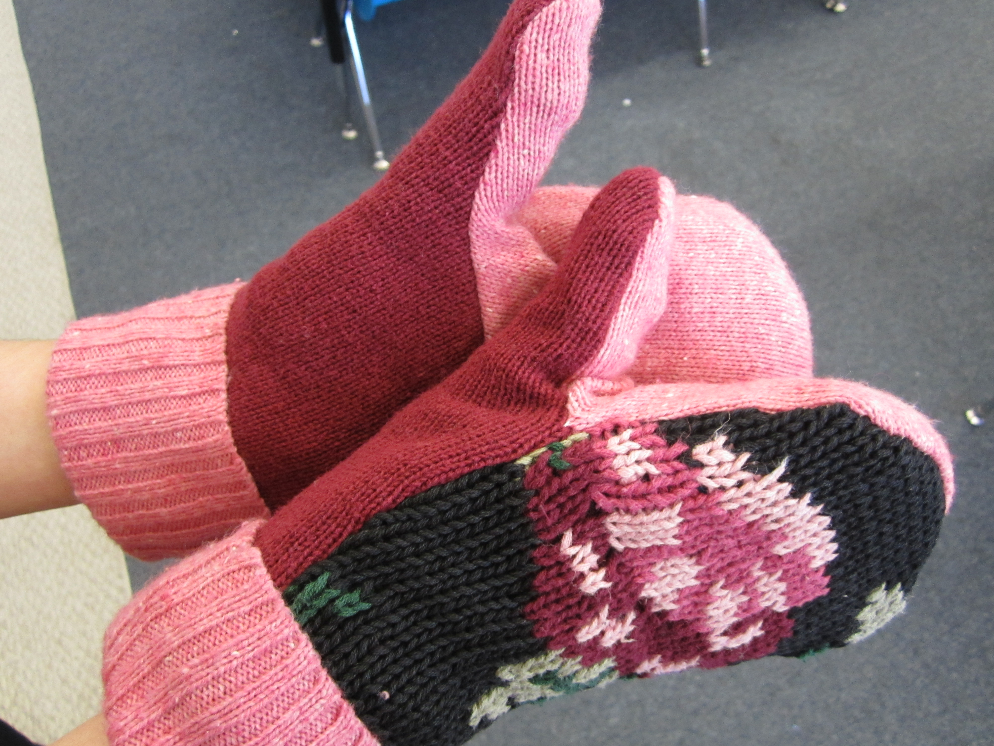 I am totally “hooked” on mittens and have given away several to family and friends. Last night I made an enlarged pair for my husband to wear when he hikes. The pair I made to wear at recess duty were the warmest gloves I have ever had!