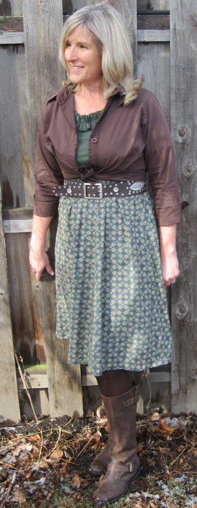 This is one of my favorite refashions so far. I used a thrift store tee shirt and an old long wrap around skirt to make this dress. I’m sorry there aren’t any “before” pictures. But I do think my son, Cooper, did a good job taking the “after” photographs considering it was only 34 degrees and we were freezing!