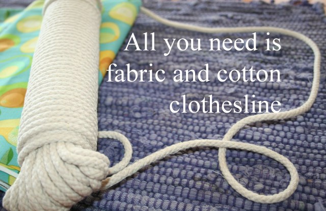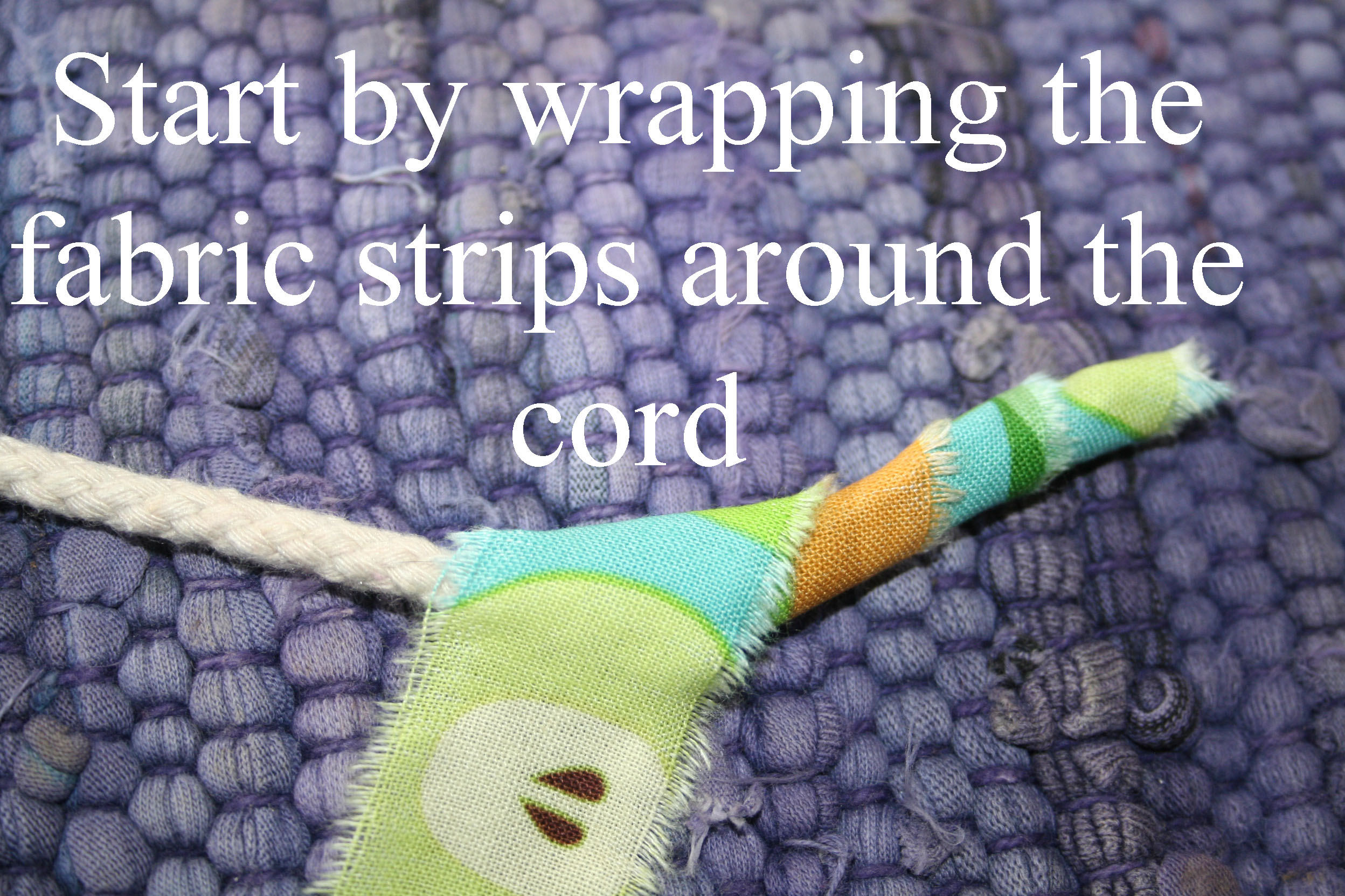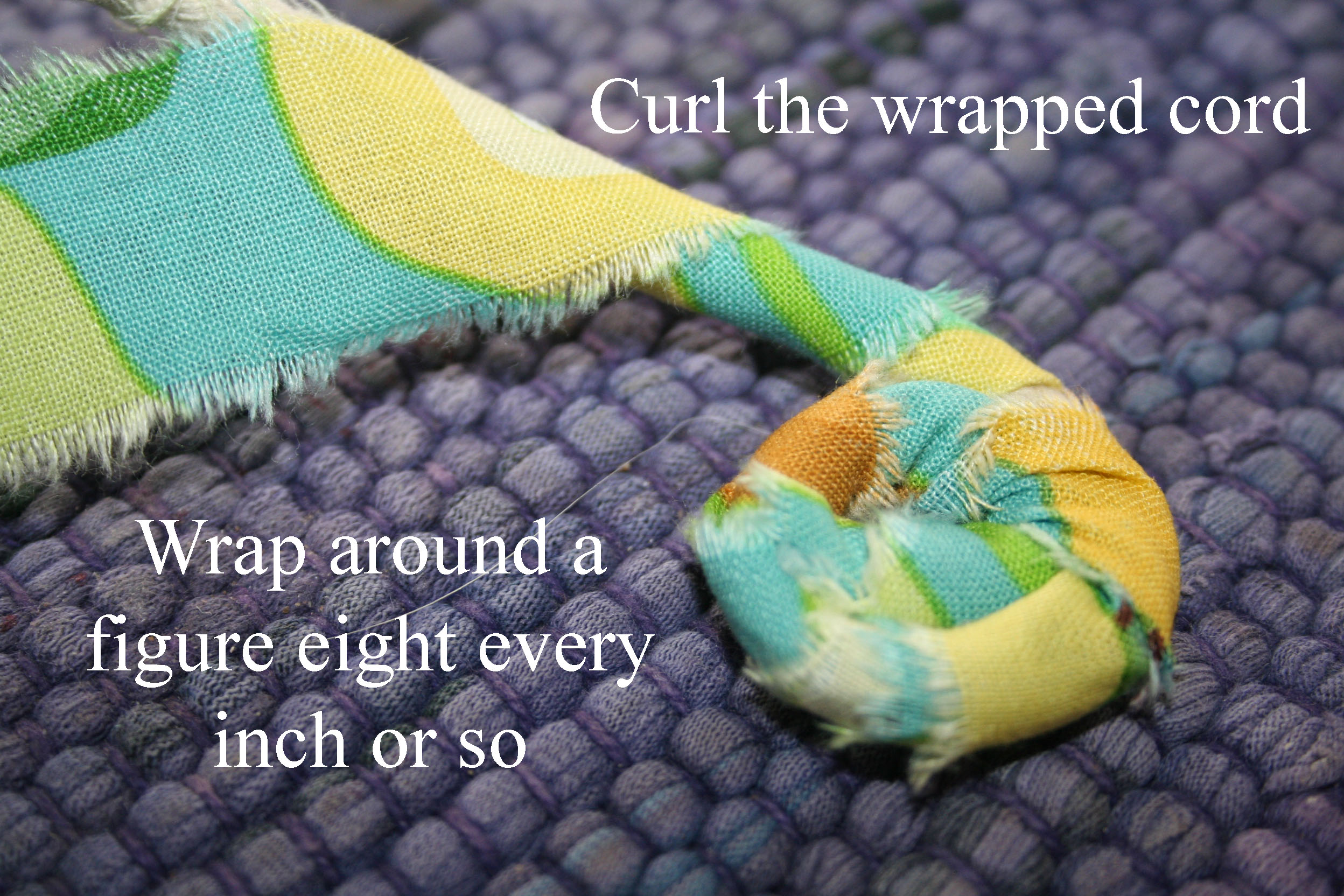 Start to wrap the fabric strips around the cord. When you get a few inches wrapped, roll the cord into a spiral.