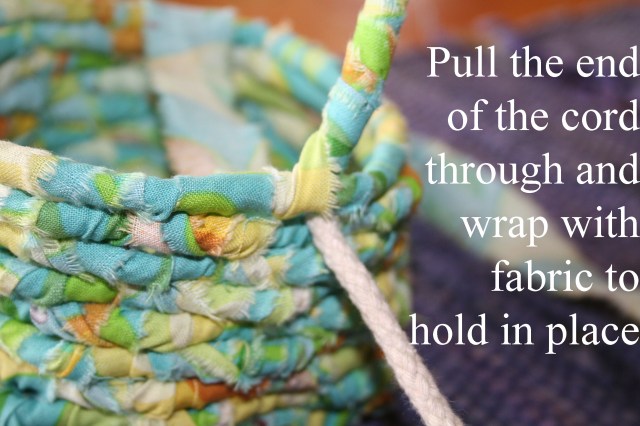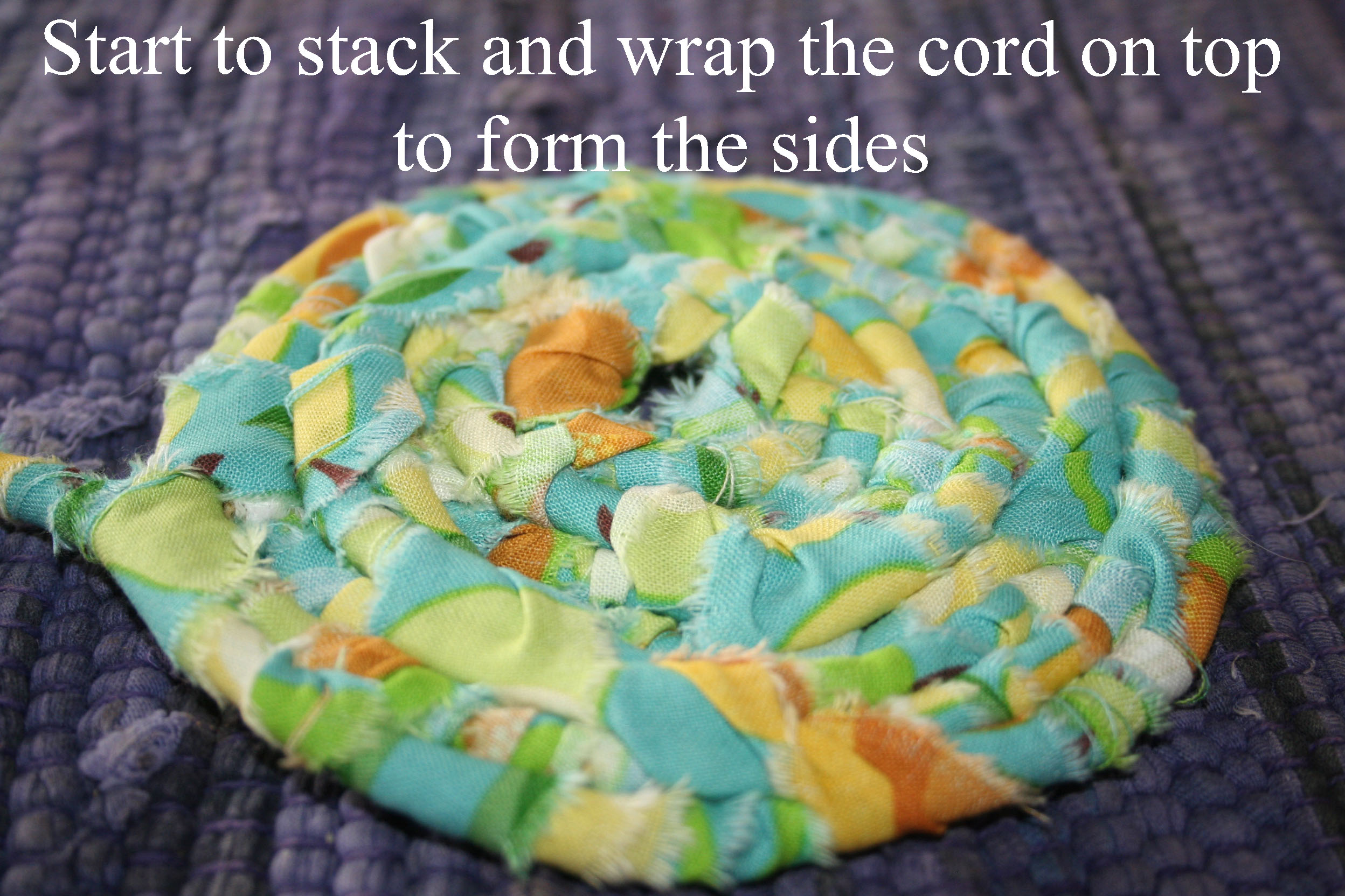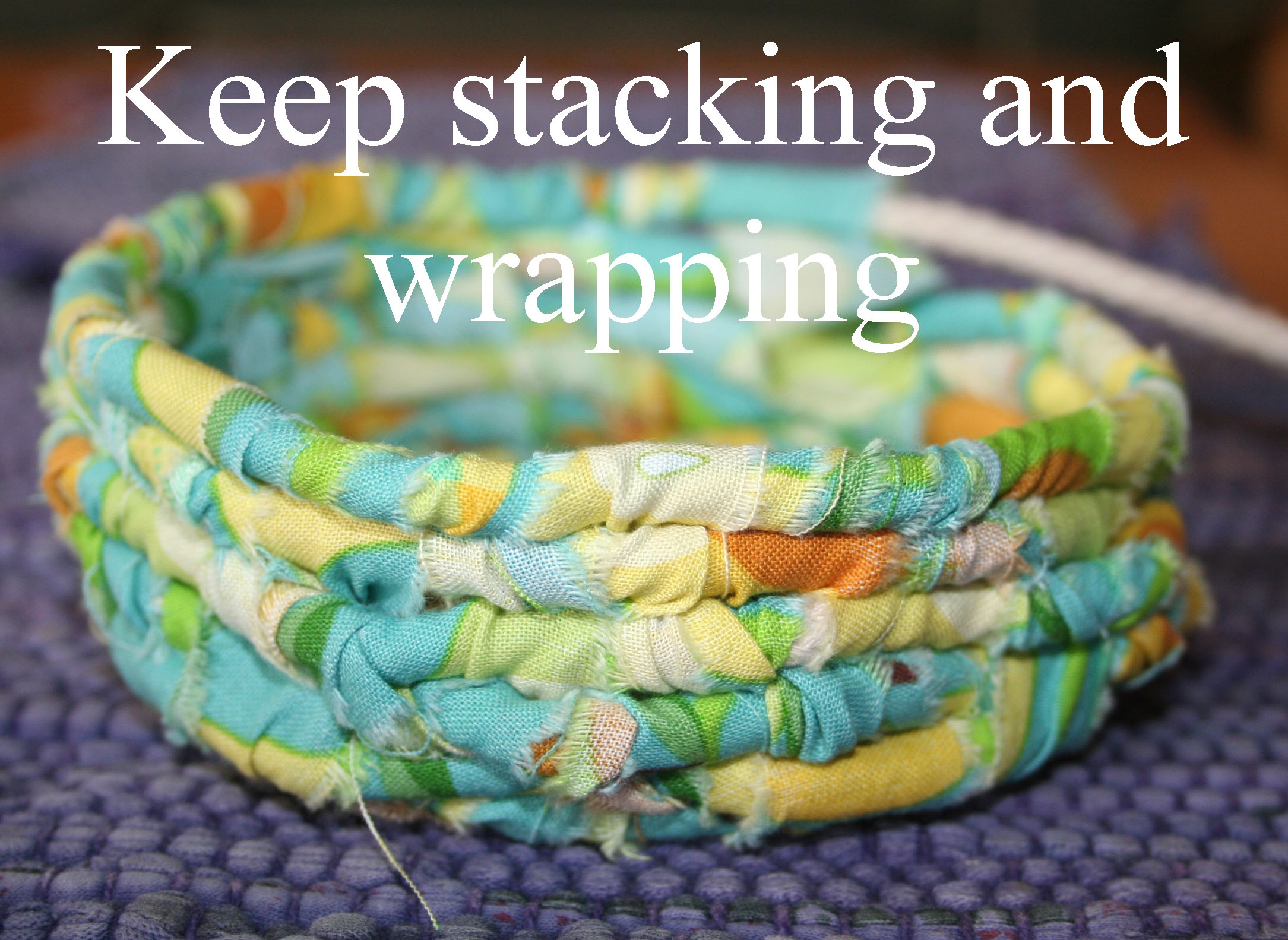 You could thread the fabric strip through a plastic needle and do it the way the DIY Network Site explains it. “Bring the plastic needle from the bottom to the top between the coiling on the previous row. Thread the needle, fabric strip down, on the left side of the fabric strip you just wound, between the previous and current coils. Bring the needle around the fabric strip to the right, and pull it up from the bottom toward you, making a “stitch.” Continue wrapping the coil. Make a “stitch” every so often to hold the current coil to the previous coil.” Let me know if this helps.
