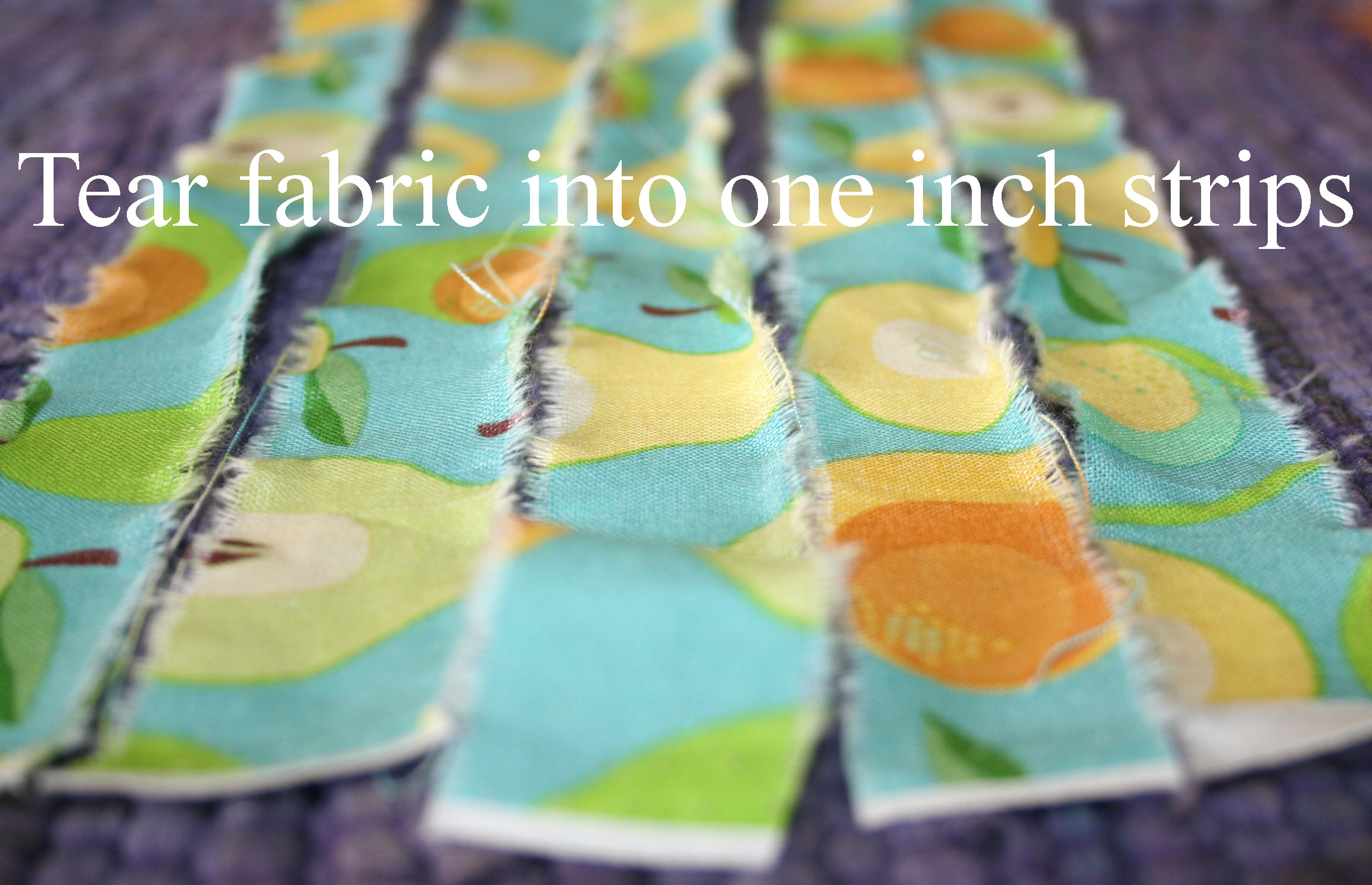 Tear the fabric into one inch strips. You could cut it, but I like the rough edges and tearing is much faster.