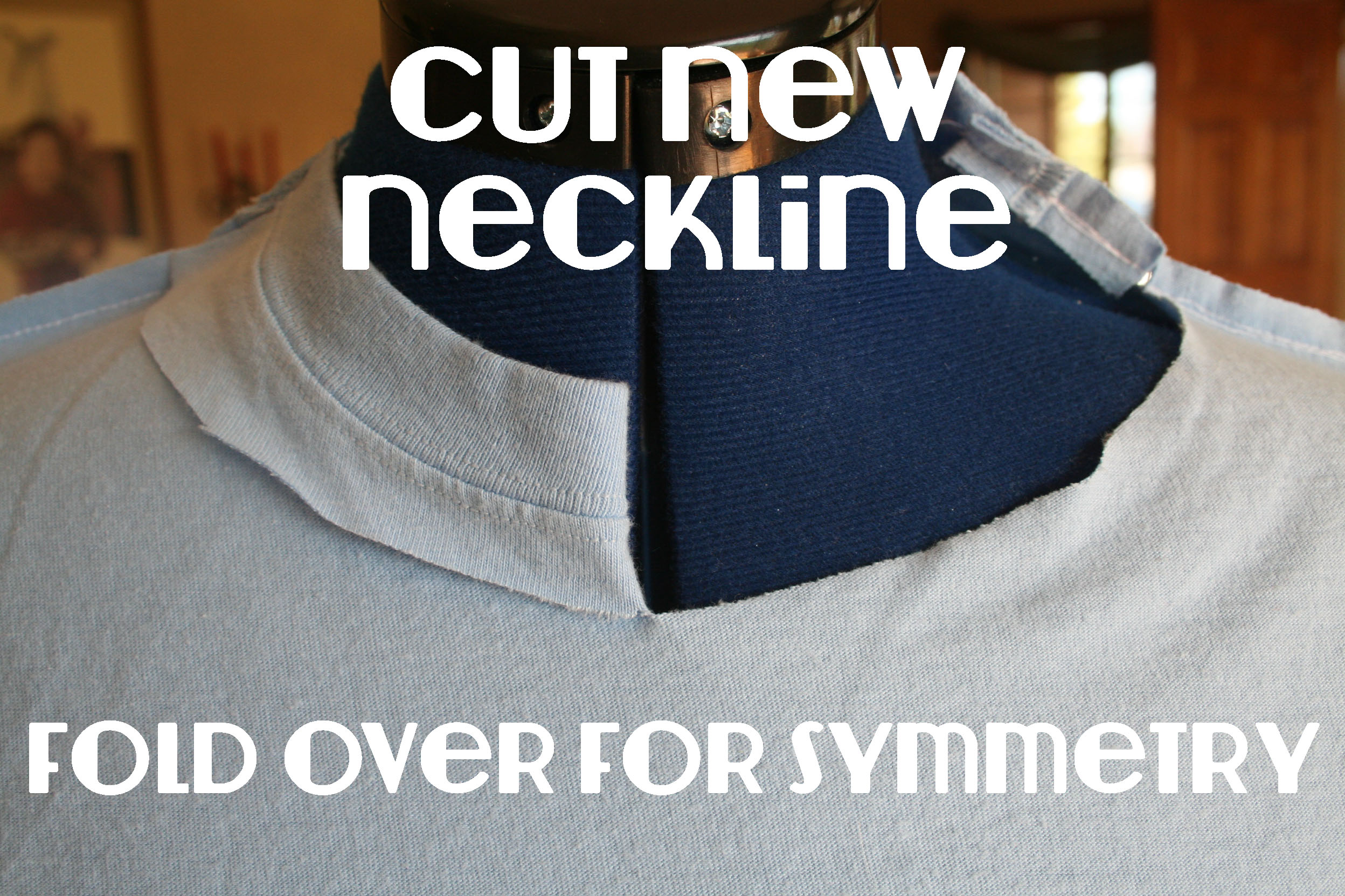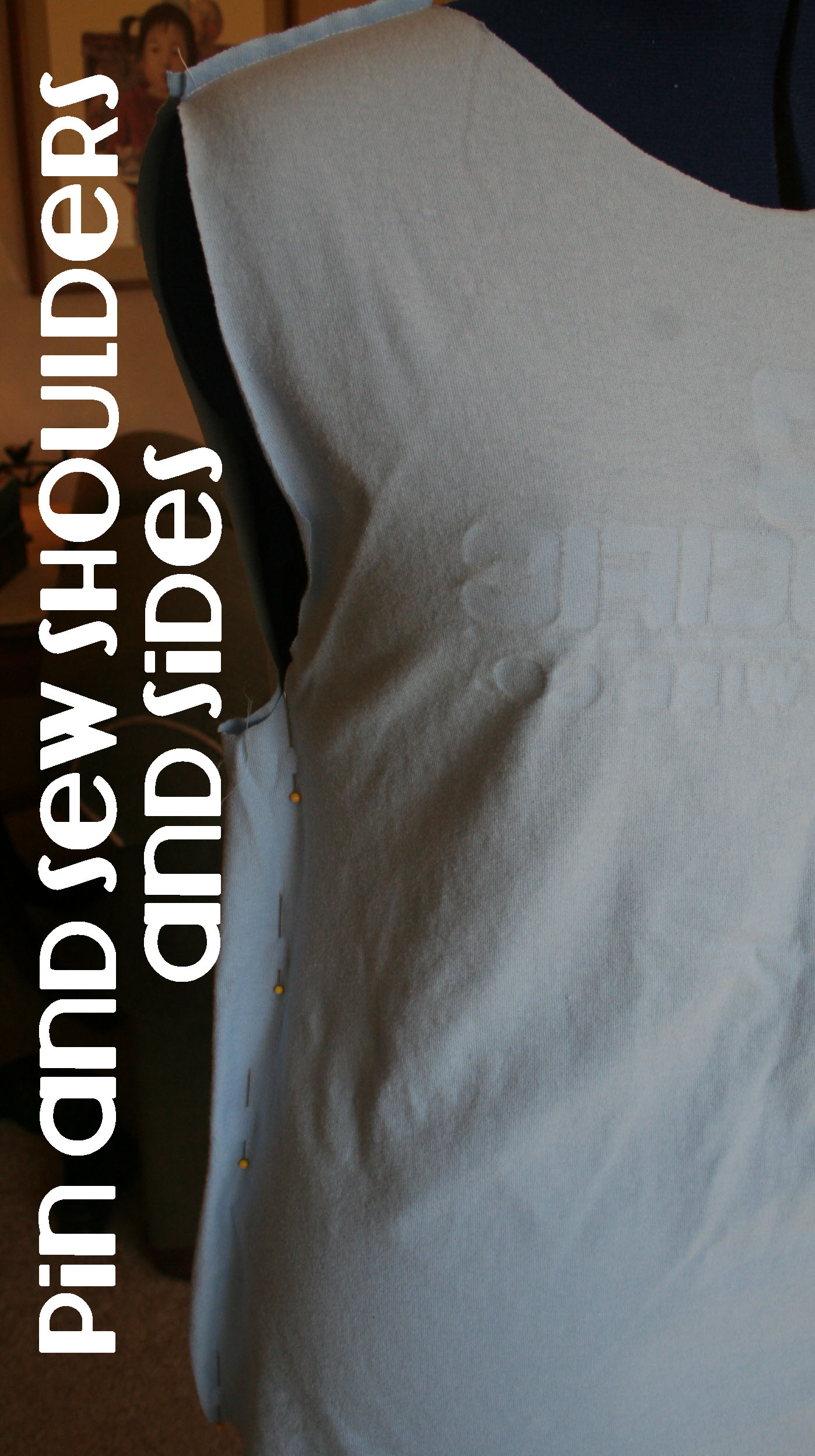 This is what it looked like at first. I used another similar blue, too small, thrift store t shirt for the pleats to cover up the logo.