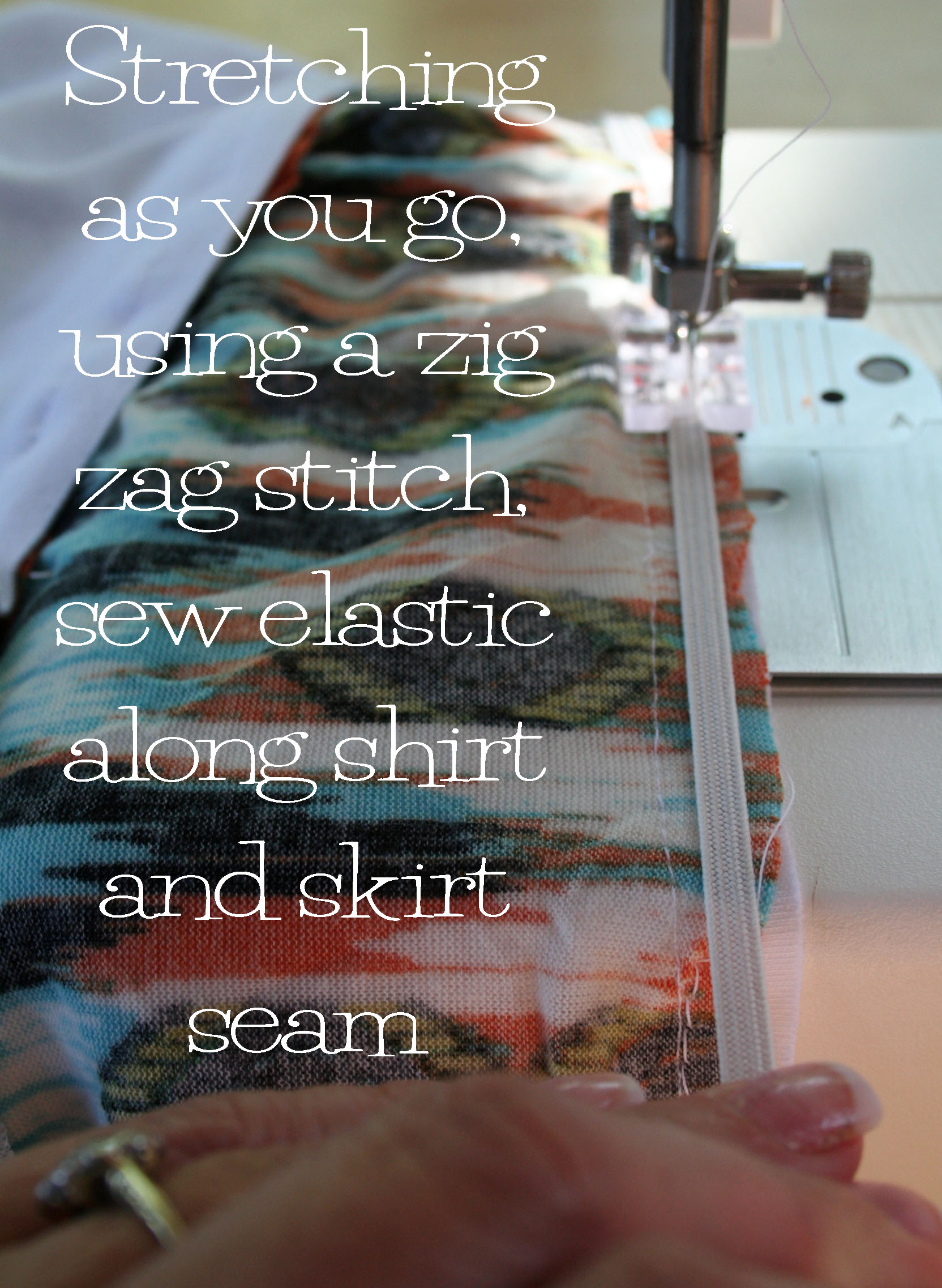 Stretch and cut a piece of quarter inch elastic under your bust to a comfortable length. Don’t make it too tight, just enough to gather in your dress nicely.