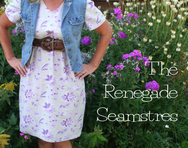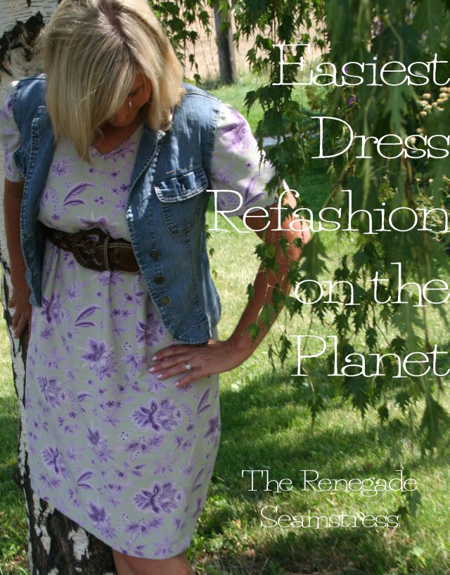 Pair it with a thrift store belt and a denim vest (which BTW used to be a denim jacket with too tight sleeves that my daughter donated to my refashioning obsession. I just cut the sleeves off and now have a vest. Thanks, Katie!). And now, I’ve got another new back to school dress.