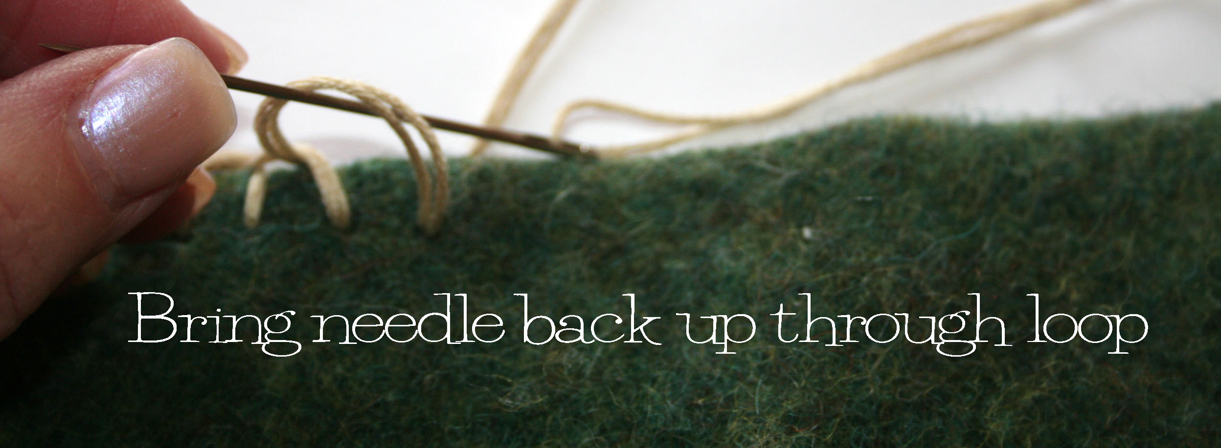 Bring needle around and back up through the loop. Pull tight and continue all around the three edges.