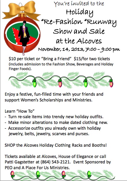 Patti Gagstetter was inspired by The Renegade Seamstress’s Refashion Runway to arrange a benefit show and sale along with her local PEO (Philanthropic Education Organization) to raise money for Women’s Scholarships in Greenwood, South Carolina.