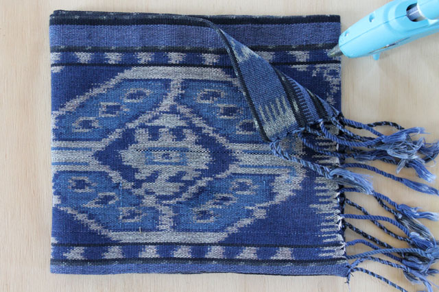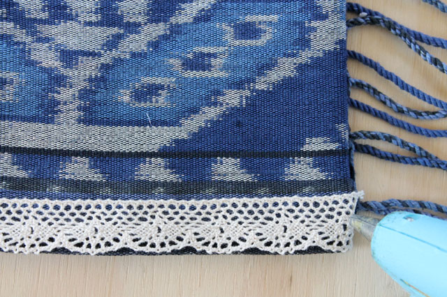 Slide the fabric tube over the top of your boot with the lace at the bottom. Wrap the denim seam around the boot and attach with a hot glue gun.