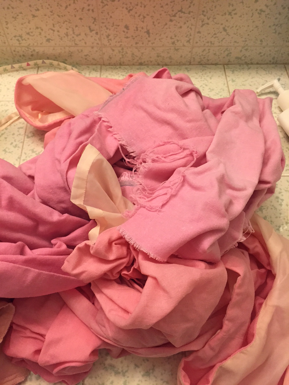 But it turned into like a Barbie pink! So I went to the store again to buy the color remover and after researching how to make blush pink(you need petal pink + lemon yellow), I put it through the wash cycle. Well, it didn’t remove or lighten the color one bit! So freaking out a little bit, I poured a ton of bleach in water(1:1 ratio) and thankfully the color started to come off.