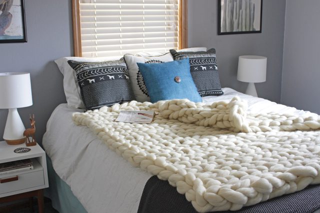 Who doesn’t like snuggling up with a cozy blanket, a good book and a steaming cup of cocoa when the weather gets cold outside? Make this on-trend, giganto knit blanket using only your hands. Yep, that’s right, no needles required for this gorgeous blanket and it only takes a couple of hours to make. Perfect for those chilly nights when the best thing to do is snuggle up next to the fireplace in your favorite chair and read. These chunky blankets look great whether they’re thrown over a chair, draped at the foot of a bed, or even rolled up and displayed in a basket.