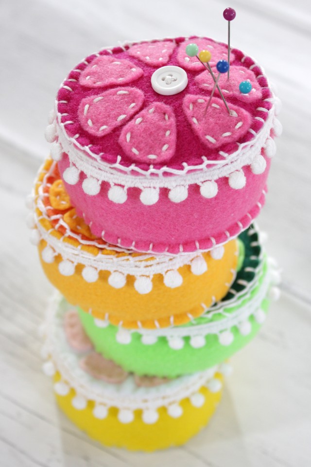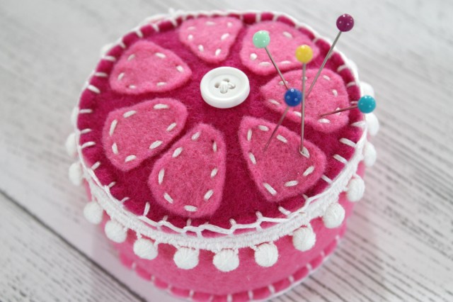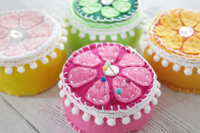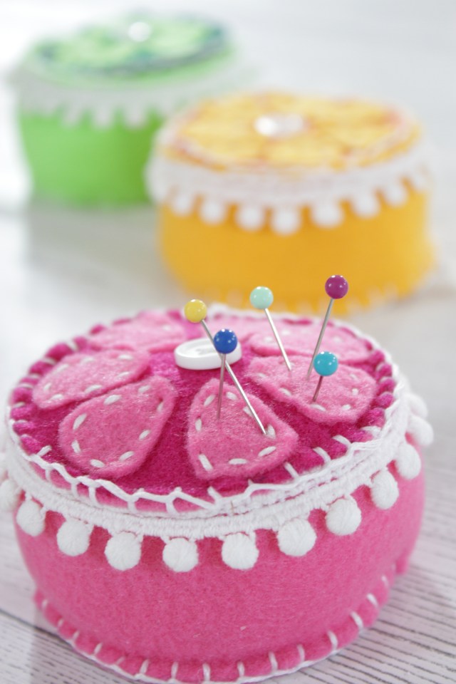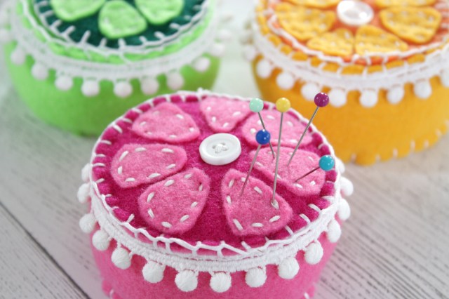 You could just store your pins in the plain plastic container they come in, but why not give one of your hardest working sewing tools the presentation they deserve with a bright, handmade pin cushion?