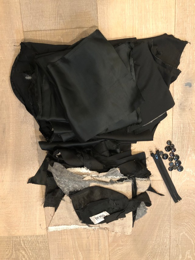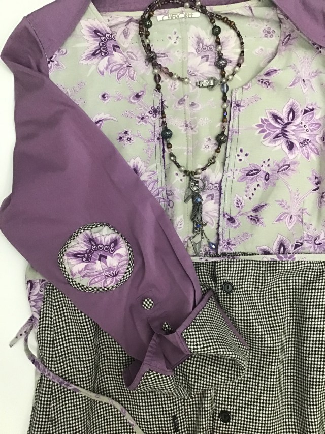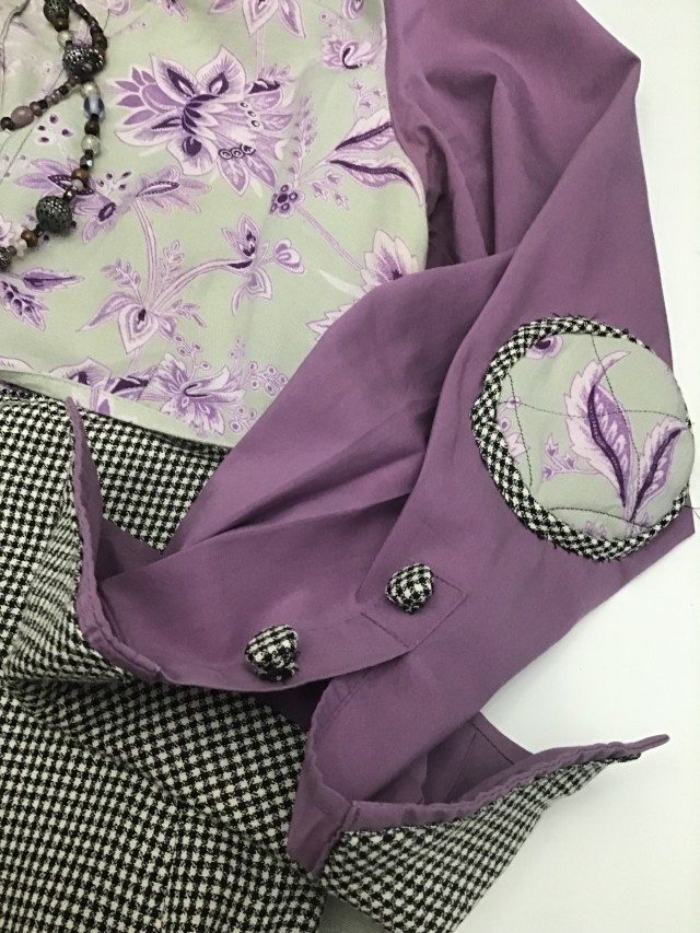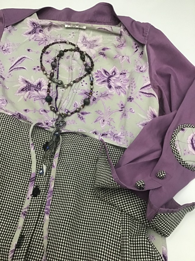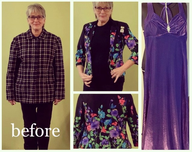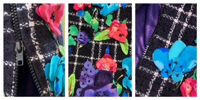 I began my challenge with a thrifted, black and white plaid (Chanel) jacket.  The fabric is yummy and the black has a bit of shimmer woven into it. I dissected a second jacket (selected for the bright, watercolor floral print) and added the fabric from a glistening purple evening gown plus a harvested zipper (?) from a little girl’s puffer jacket!