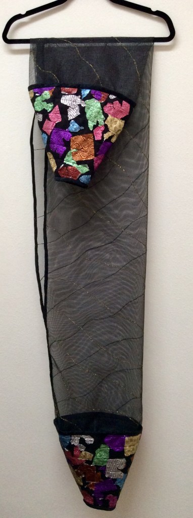 I couched metallic gold decorative thread to the screen mesh before seaming the tube together. All of the seams and edges were covered with bias strips cut from the thrift store black silk skirt.