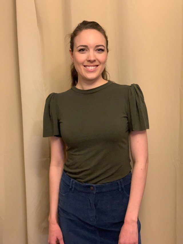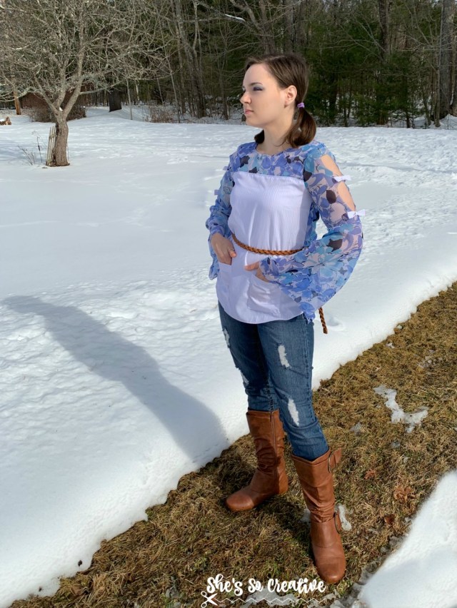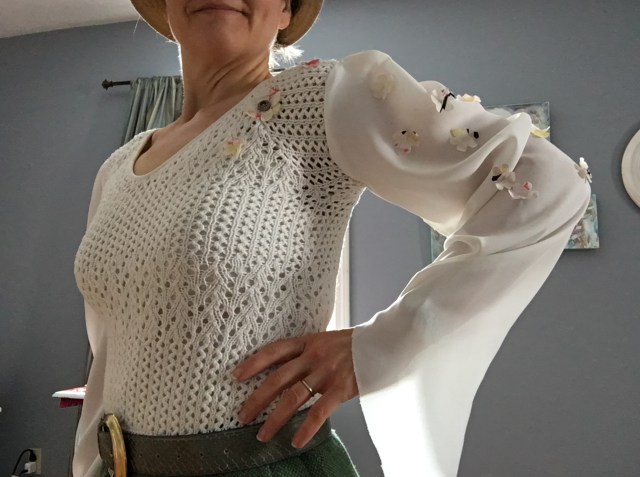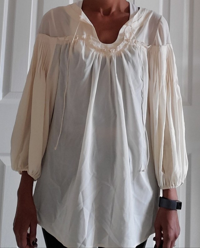 “I liked the material of this blouse and some of the details but the sleeves were awkward and it looked frumpy. I removed the old sleeves from the bodice and took out the elastic. I cut and reshaped the sleeves to make them look puffy. I love the pleated part so I kept it. I reshaped the neck to fit better and flipped the opening to the back. I added elastic at the bottom hemline to give it shape.”
