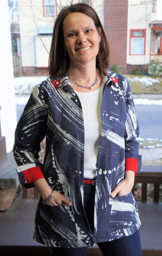 I like making garments convertible, so that I can wear things differently depending on my mood. I can unbutton the collar detail and roll down the sleeves if I don’t want as much of the red to show.