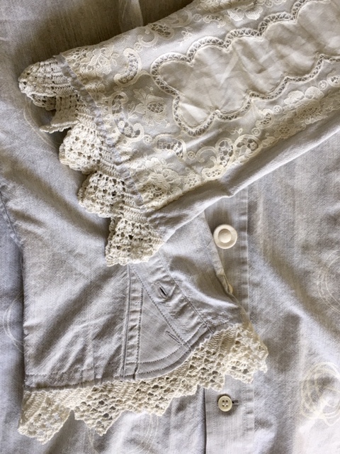 With the addition of the godets the ends of the sleeves now had a bell shape with a raw pinked edge. I underlined the cuff with vintage lace, making the length a perfect long sleeve. Using what was left of the lace, I edged the collar, creating balance with the sleeves.