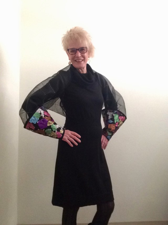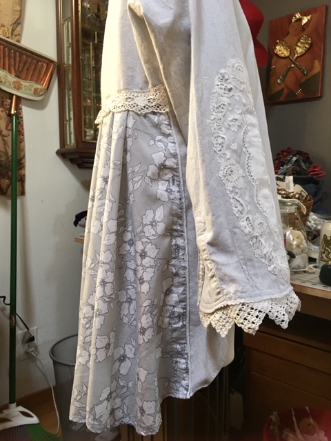 I wanted to say a little bit about the process I use to create my garments,  It’s a different approach to upcycling.  I like to start with a basic garment.  And I usually search through my closet first.  The garment I pick becomes my canvas.  The pieces of fabric, that I’ve saved from previous projects, upcycling, thrift stores and antique stores, become my paints.  I then layer piece upon piece to achieve the desired look I want. It’s like I’m painting with fabric!  I feel the most unique thing to use, when creating an upcycled garment, are doilies and crocheted tablecloths.  A lot of love and work goes into their creation.   They are totally a work of art. To see these amazing pieces discarded is heart breaking.  As a result, I chose to use both pieces as my focal points.  First, I used a beautiful doily to create the sleeves.  I cut it in half, created folds and sewed it on.  Next, I used an amazing crocheted tablecloth for the bottom half of the dress.  I really wanted to highlight the scalloped edge of the tablecloth, so I made sure it showed in the front.  I also made a shrug from the bottom half of the dress that I had cut off.
