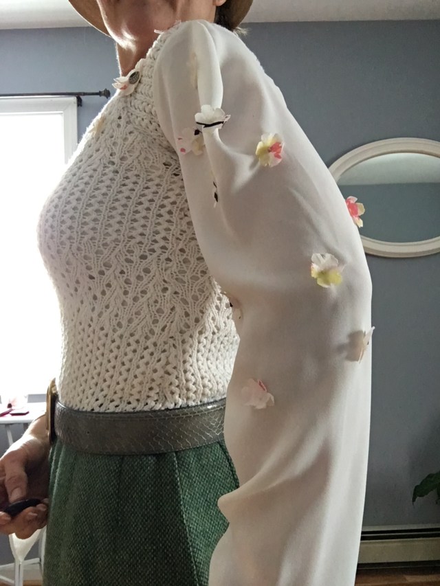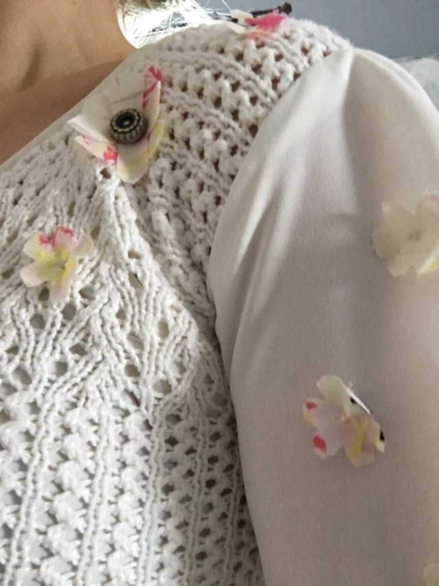 the sweater and then cut and hand-stitched the blossoms on the sleeves and
