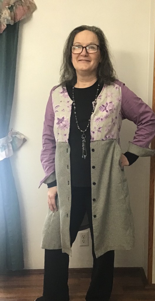 My jacket started life as a dress that a friend gave me. She didn’t like it, but she thought the linen-cotton blend fabric was nice and the print was cool. She gave me a challenge to refashion it. Challenge accepted! Here’s the before look: