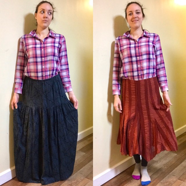 “For this round I chose to go with a high waisted corduroy skirt and a flowy