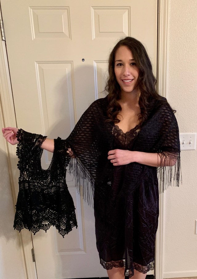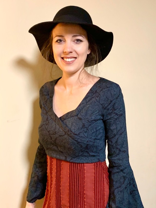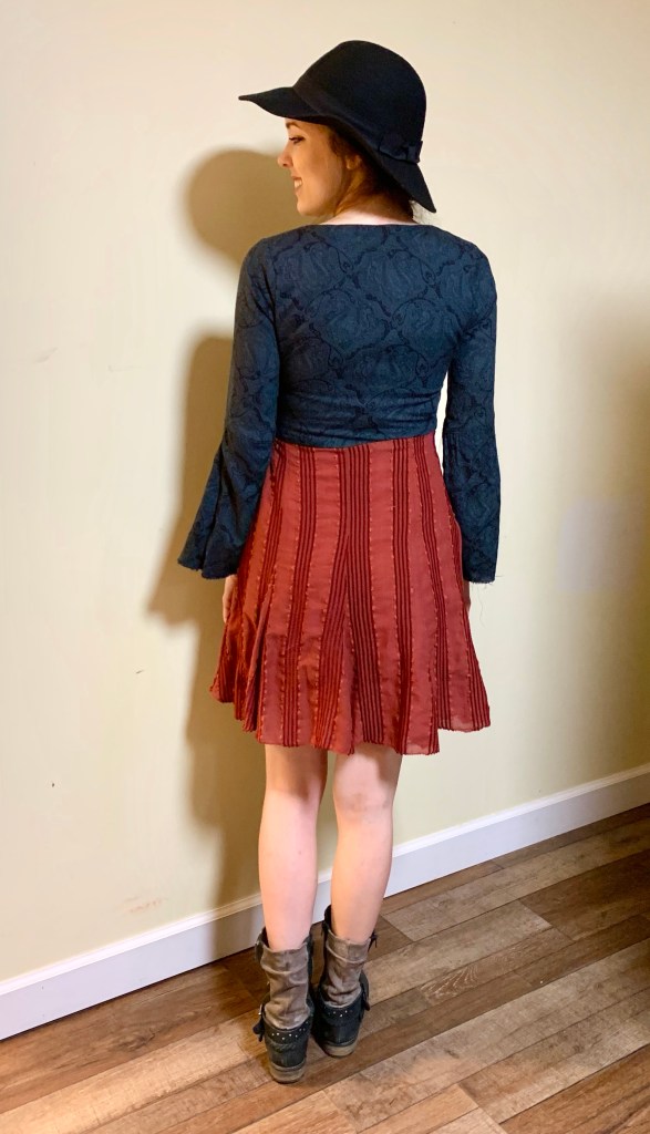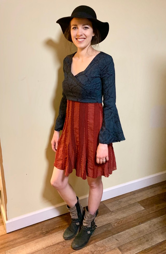 It all began with a dress that I used as a pattern for this one. I traced the shape of the dress but then changed it so that it was a wrap bodice. I cut out a lining from leftover fabric from a previous upcycled project and the top from a thrifted skirt that my mom had given me and used a thrifted Goodwill skirt for the bottom. I cut out the pieces and the battle began. Just kidding! Things went pretty well at first. I sewed darts and the wrap part at the top. Things started to get complicated when I was trying to figure out the wrap around bodice and the zipper and the lining. At one point I held up this big ball of twisted fabric because I had no idea how to untangle it (I took a picture for y’all!). I took a break and when I came back We made peace I was able to untangle it and continued moving forward. I added the zipper, sleeves, and finally finished things up with a zig zag stitch around the bottom of the sleeves and hem of the dress. I always learn from my sewing projects and I learned a lot from this one! I had a lot of fun too, despite The big ball of tangled fabric I had for a while! It turned out well in the end!