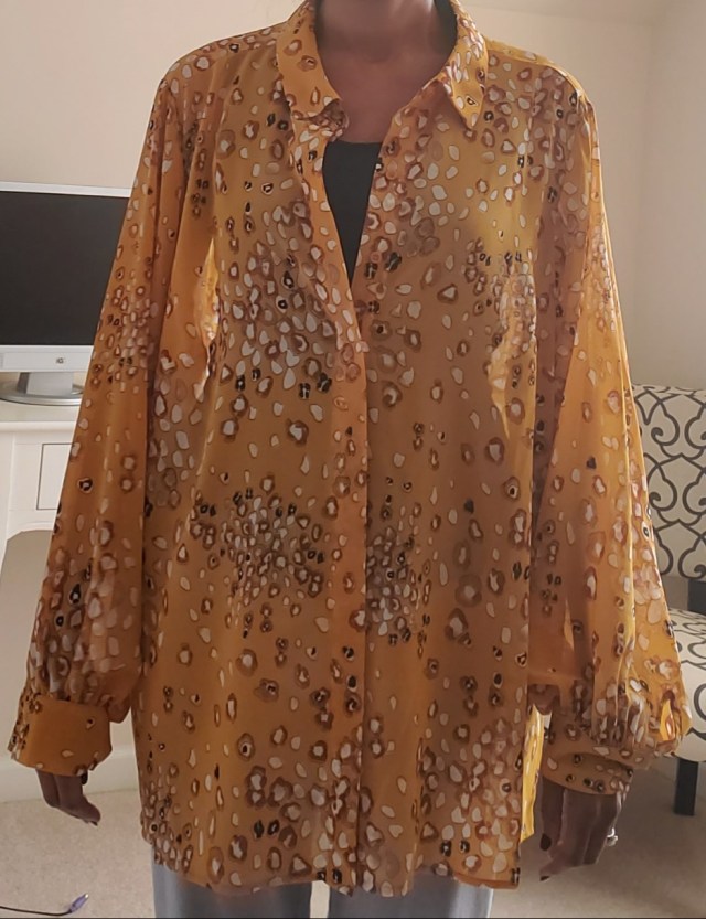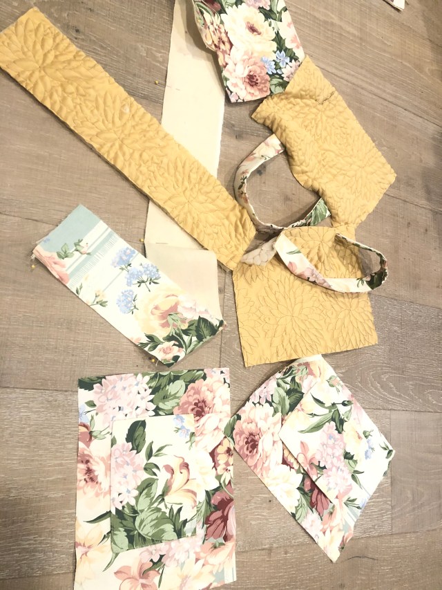 Blouse: I loved the chiffon fabric and color of the blouse. I took off the sleeves, collar, buttons, and recut the bodice to fit me. created a more fitted wrap style. I made the waist ribbon and sleeve binding from the excess fabric.