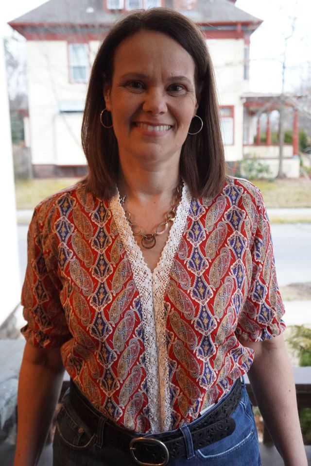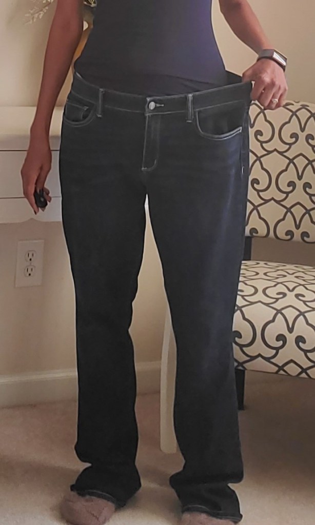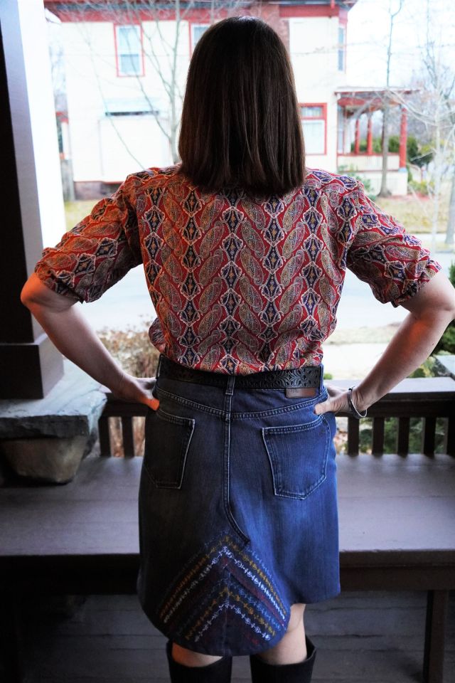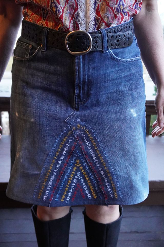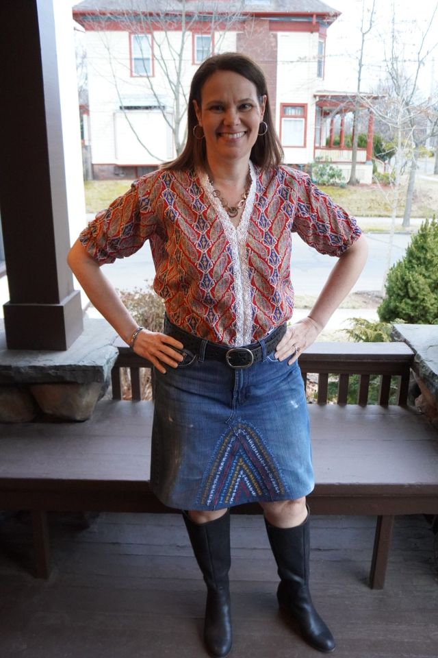 Jeans: I found these really soft, stretch jeans to resize. I made them high- rise by adjusting the crotch and taking in the waist. I also flared the bottom by taking in the thighs.