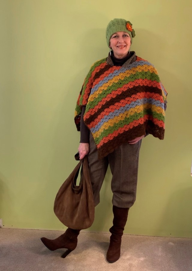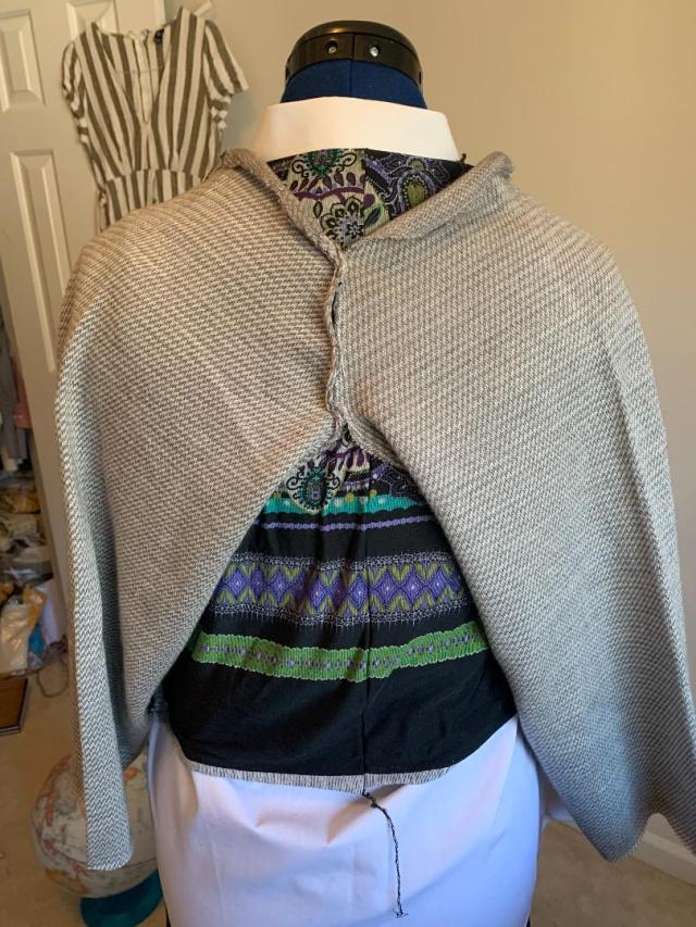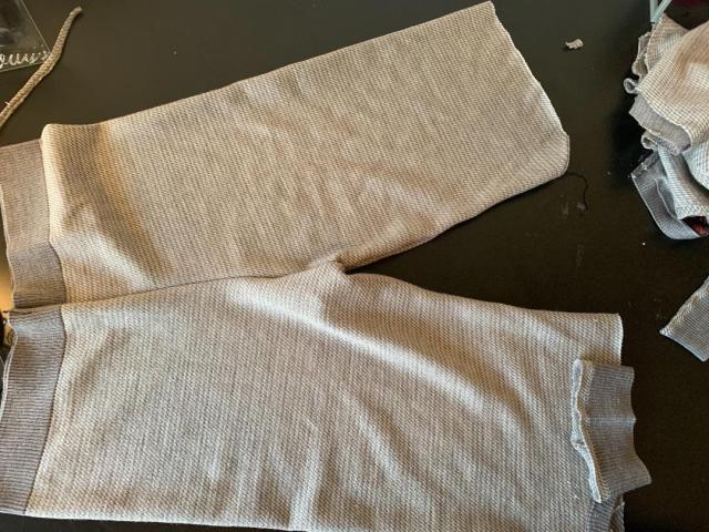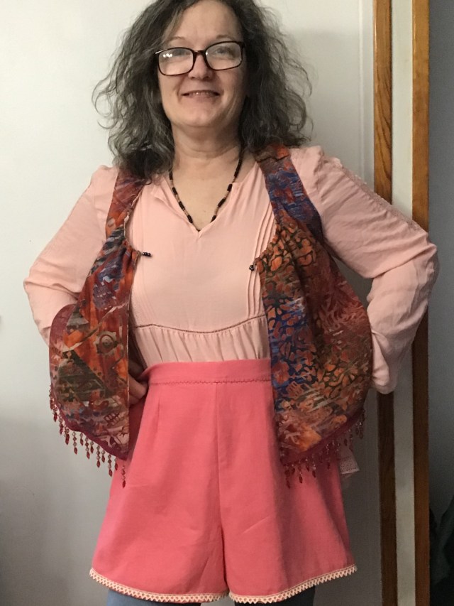 When I was in high school in the late 70s I had a wonderful pair of knickers. I wore lots of comfy sweaters. This old sweater was used to recreate both. I used the original bottom of the sweater and cuffs from the sleeves to bring the look together. I also cut front and back together to avoid side seams. Once the knickers were done the remaining sleeves were used to make a bolero style vest. Selvages from the original sleeve bands were sewn together to cuff the sleeves. The whole look was made easy with the aid of my serger.