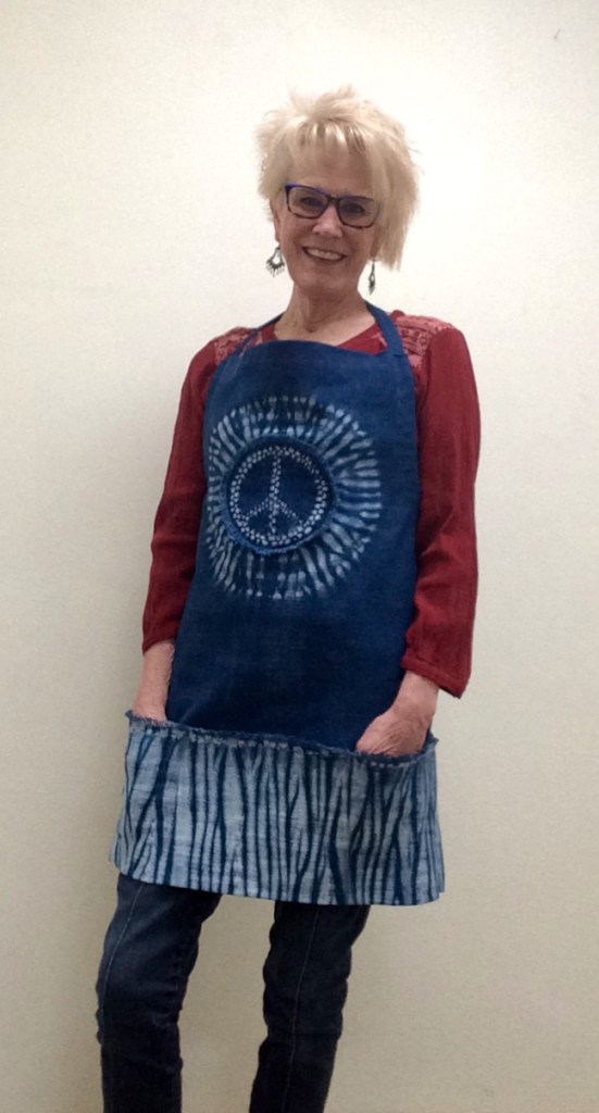 Arashi, or pole wrapping, shibori created the stripes on the apron pockets.