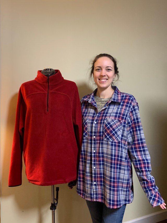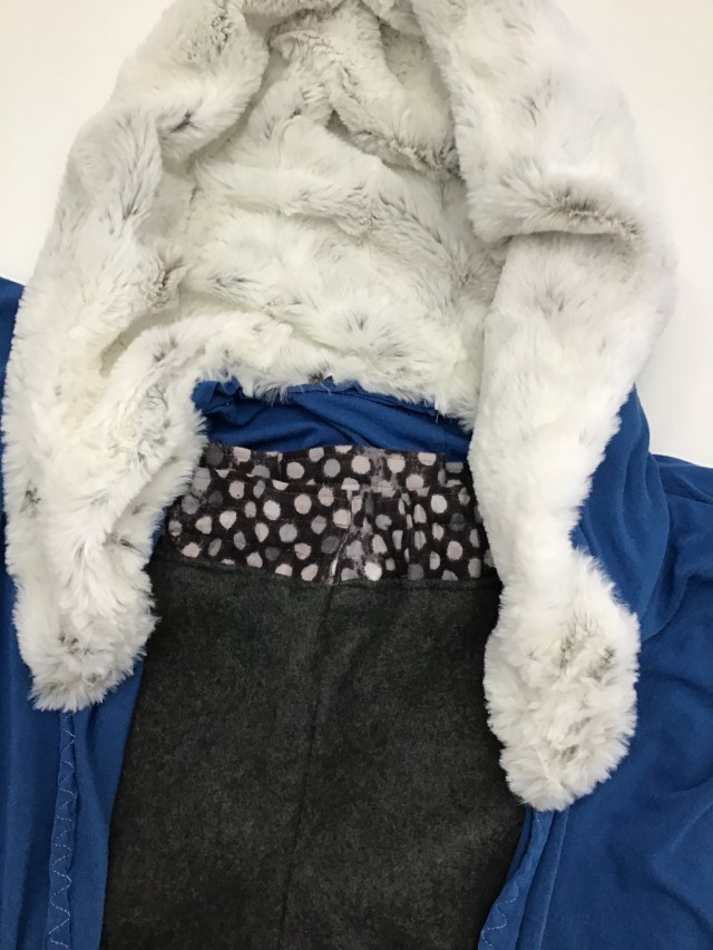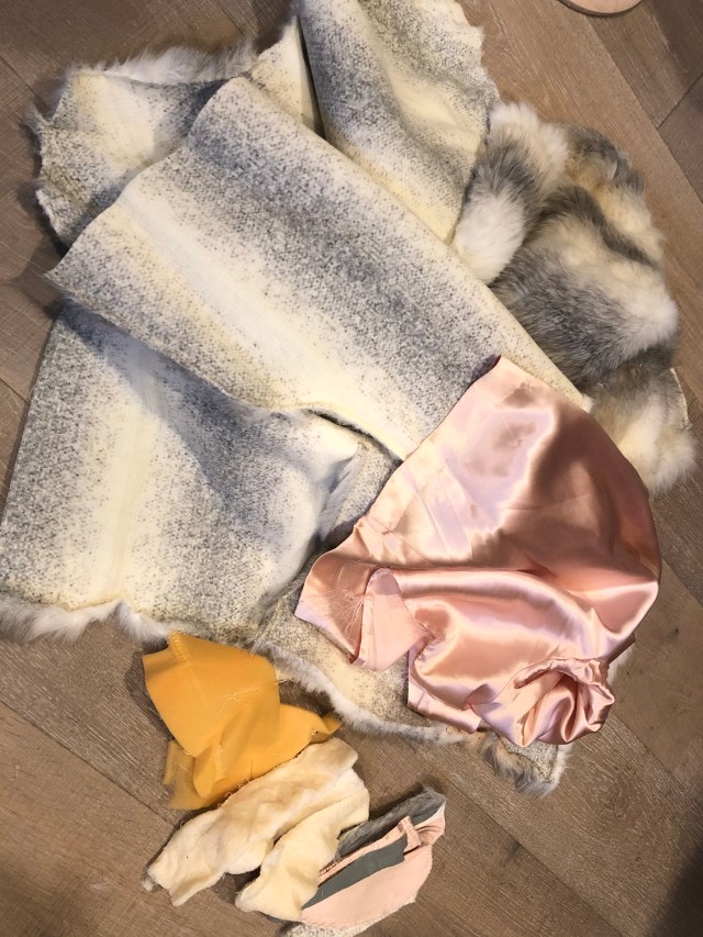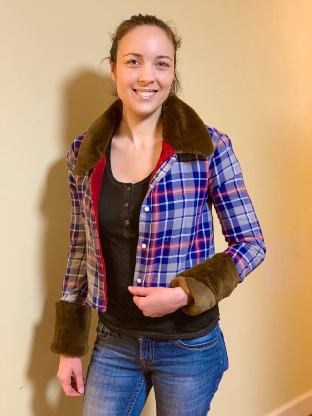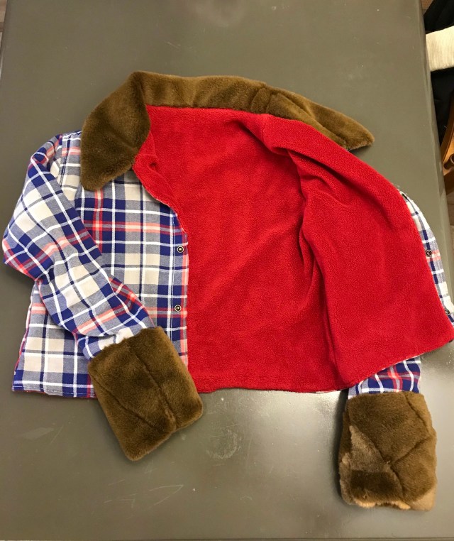 Hey everyone! When I went to my local thrift shop I didn’t find a lot of options for faux fur in the clothing section, so I used stuffed animals. I also used a men’s button up that I thrifted and my husbands old jacket that he was planning to get rid of. Since it fit me in the shoulders I used the shirt for the outside as a guide for how I wanted my new jacket to look and used my husbands old jacket for the lining. And the faux fur for the cuffs and collar.
