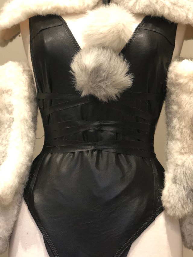 I made the leather swimsuit from the black leather dress and used the leftover leather to attach the tassels to each piece.