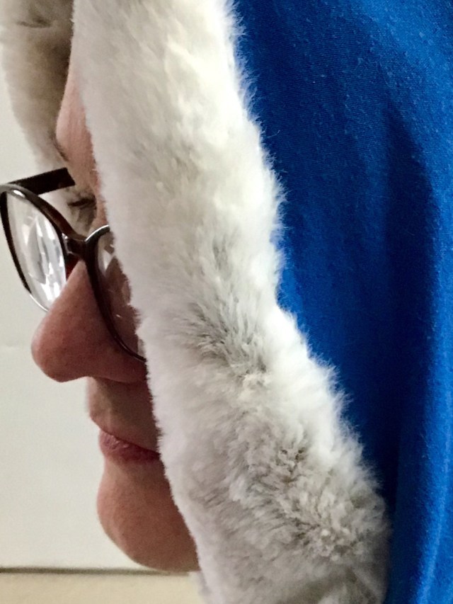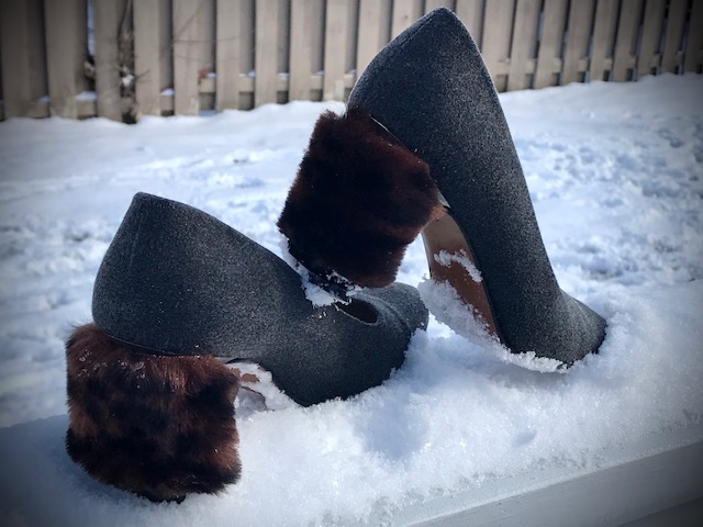 The crown of the hat using the vintage fur collar. The boot toppers and rolled brim of the hat used the sleeves from the faux fur coat.