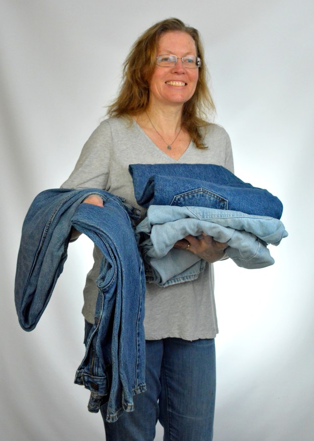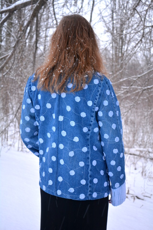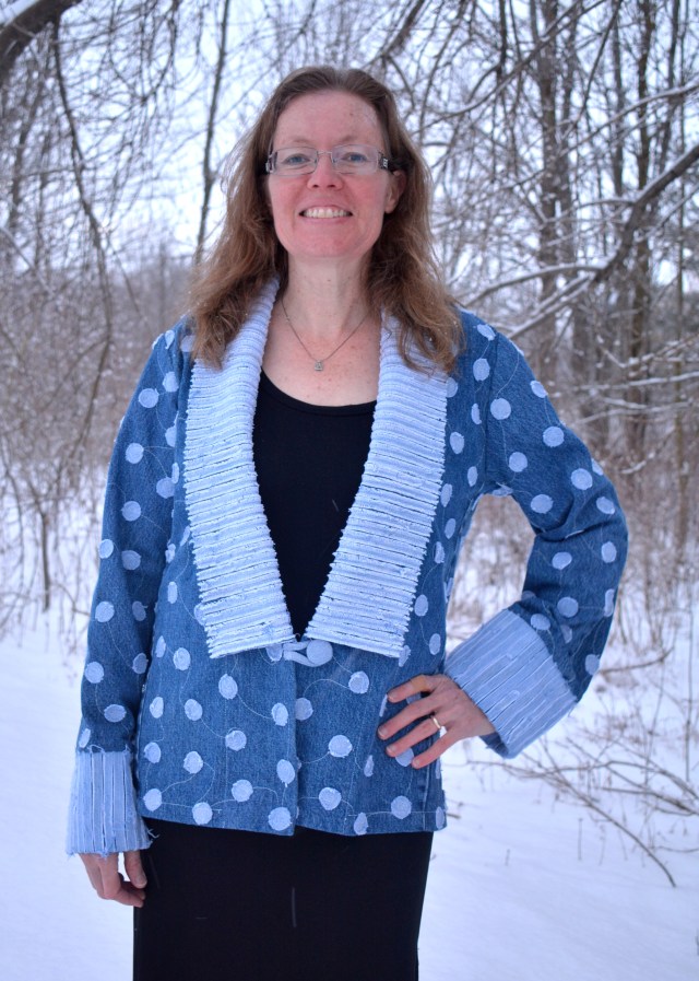 I’m loving the result. It is a very wearable vest, much more so than the jacket. Paired with a thrifted linen blouse, thrifted jeans, and gifted earrings it looks great.