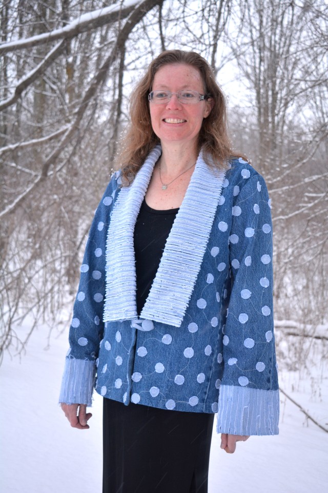As a textile artist and restyle designer, I approach each challenge with the goal of creating artistically refashioned wearable pieces. This week the result is a glistening coat dripping with elegance!