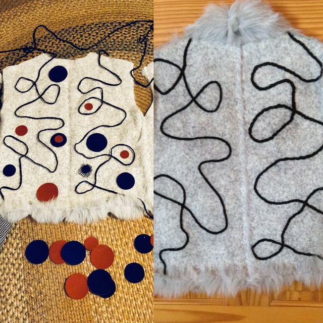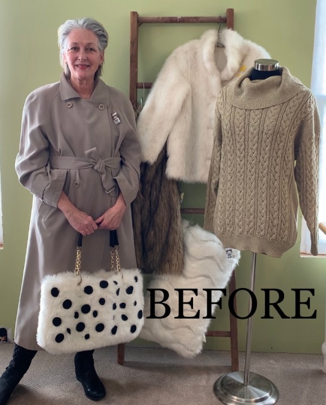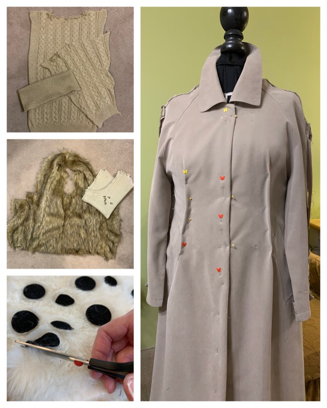 My before items included a girl’s ivory fur jacket, a faux racoon vest, a diy Cruella Deville tote bag, a metallic gold sweater and a basic taupe trench coat. What a crazy collection of findings!