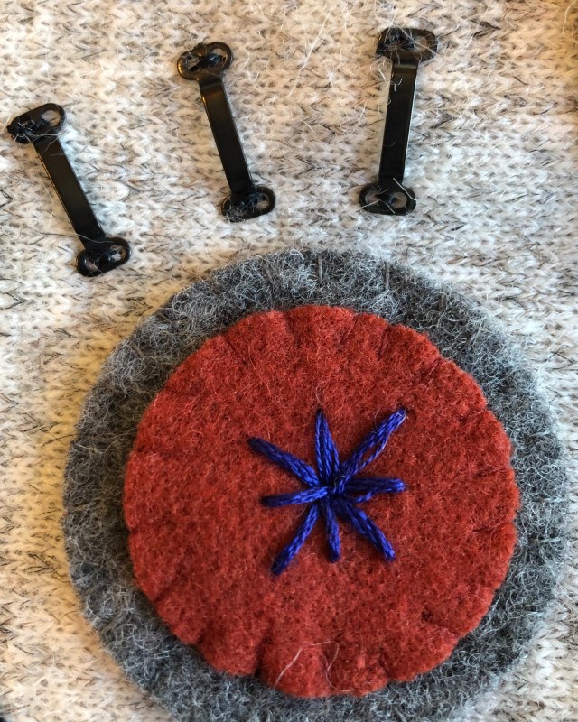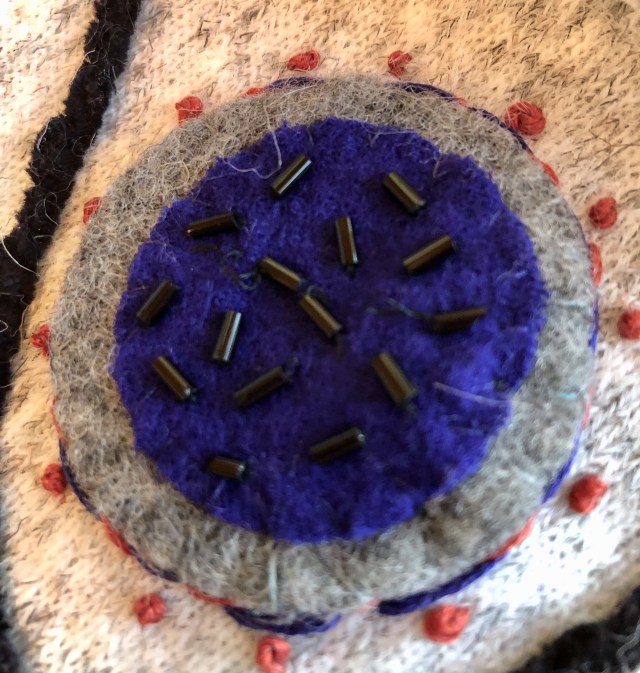 Details of felted wool appliqués. The hook & eyes and snaps were harvested from the wool pants and skirts before felting process. Seed & bugle beads and embroidery floss were all from my stash.