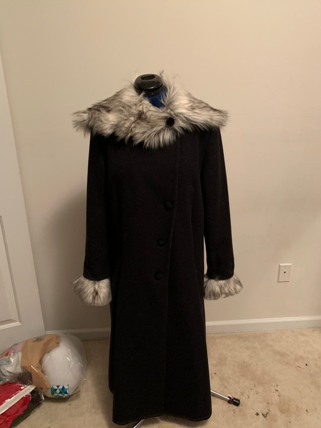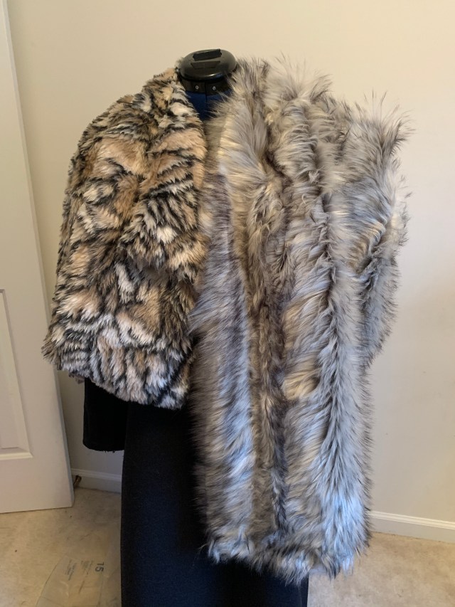 I started with a classic wool coat with velvet cuffs, pocket covers and collar. I purchased two kinds of faux fur and made removable collars and cuffs. The coat can still be worn without them. I refitted the coat and removed the double breasted front and the former pockets. The pockets were replaced with pleats and the double breasted buttons for an asymmetric look. I also removed the collar, cuffs, and pocket covers. Each fur piece was prepared be removing fur from the seam allowances and undersides were lifted with satin. I also made an additional velvet button from the cuffs that I removed to make the collars pop. The button is interchangeable between the collars with an elastic attachment. The collars and cuffs are attached with elastic and buttons for easy removal.