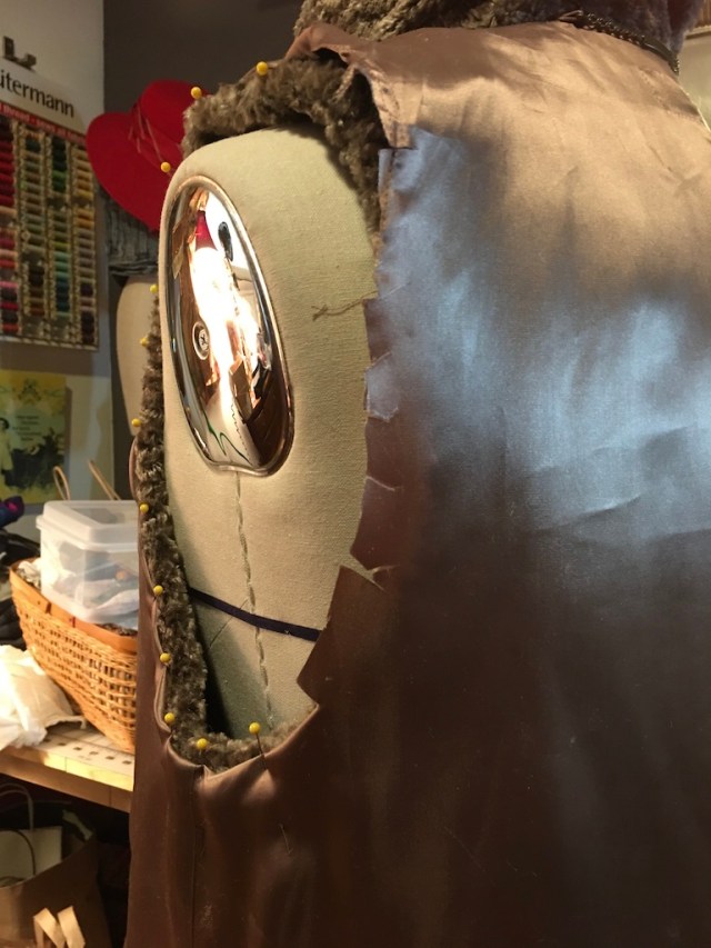 After turning under the raw fur edges and stitching them in place by hand I tackled the lining. In order to curve the lining shy of the armhole opening I clipped it all the way around, turned it under, and hand stitched it in place.