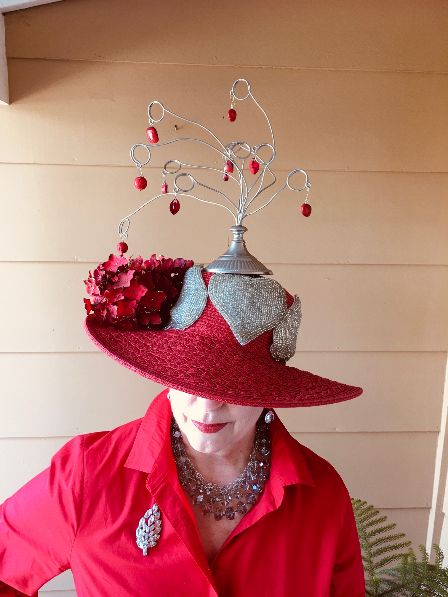 I actually designed this hat around a dress my model has, so I decided to dye the white fabric pink to match her dress (and shoes!), but I ended up having to model it myself (red dress to the rescue!) I’m so glad I dyed it pink, it really adds that perfect “pop”!