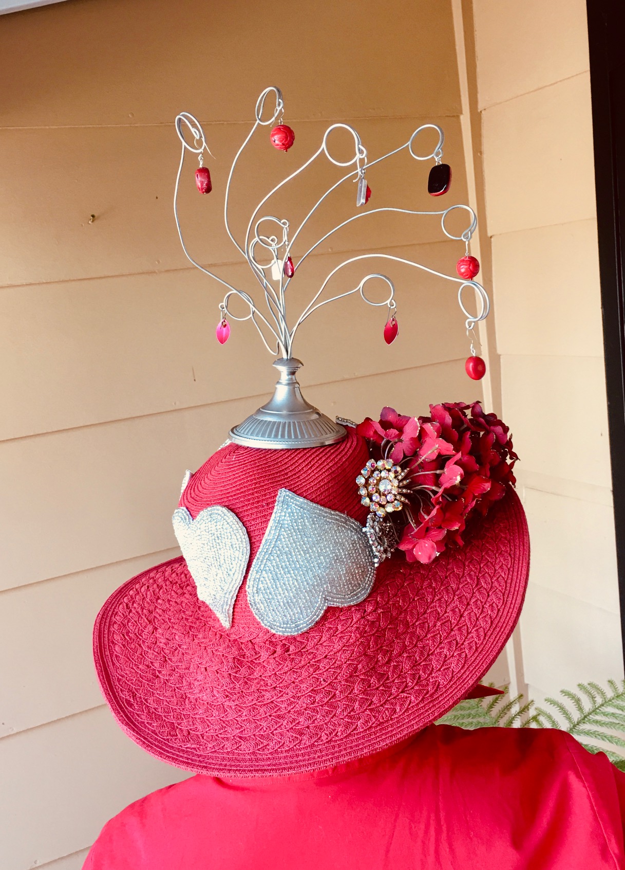 I also used some floral wire and beaded some of the pearls from the wedding dress bodice onto them to give the “hat” a little more romance and visual texture. I added one pink flower to each tip to tie it together. I added one pink flower to each tip.