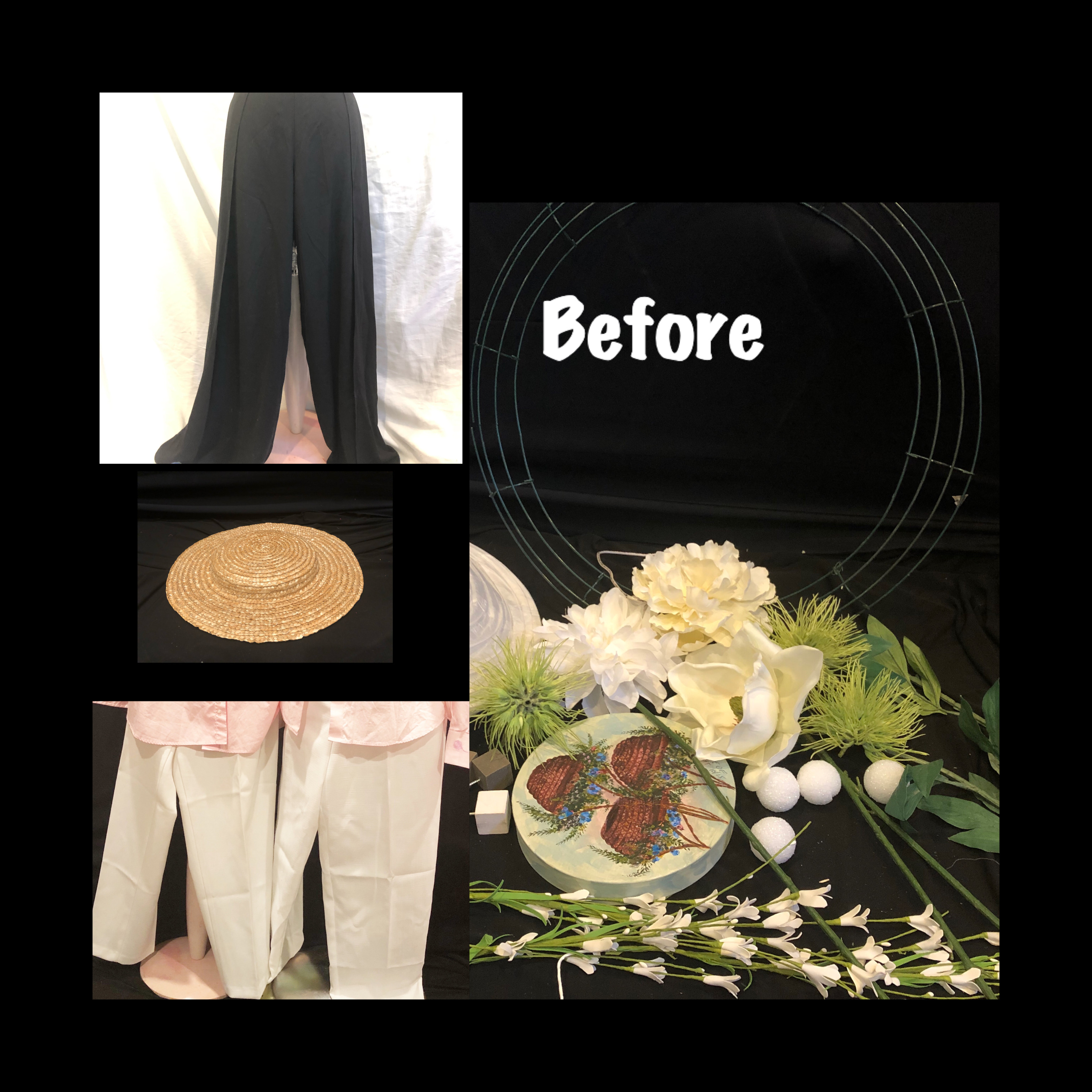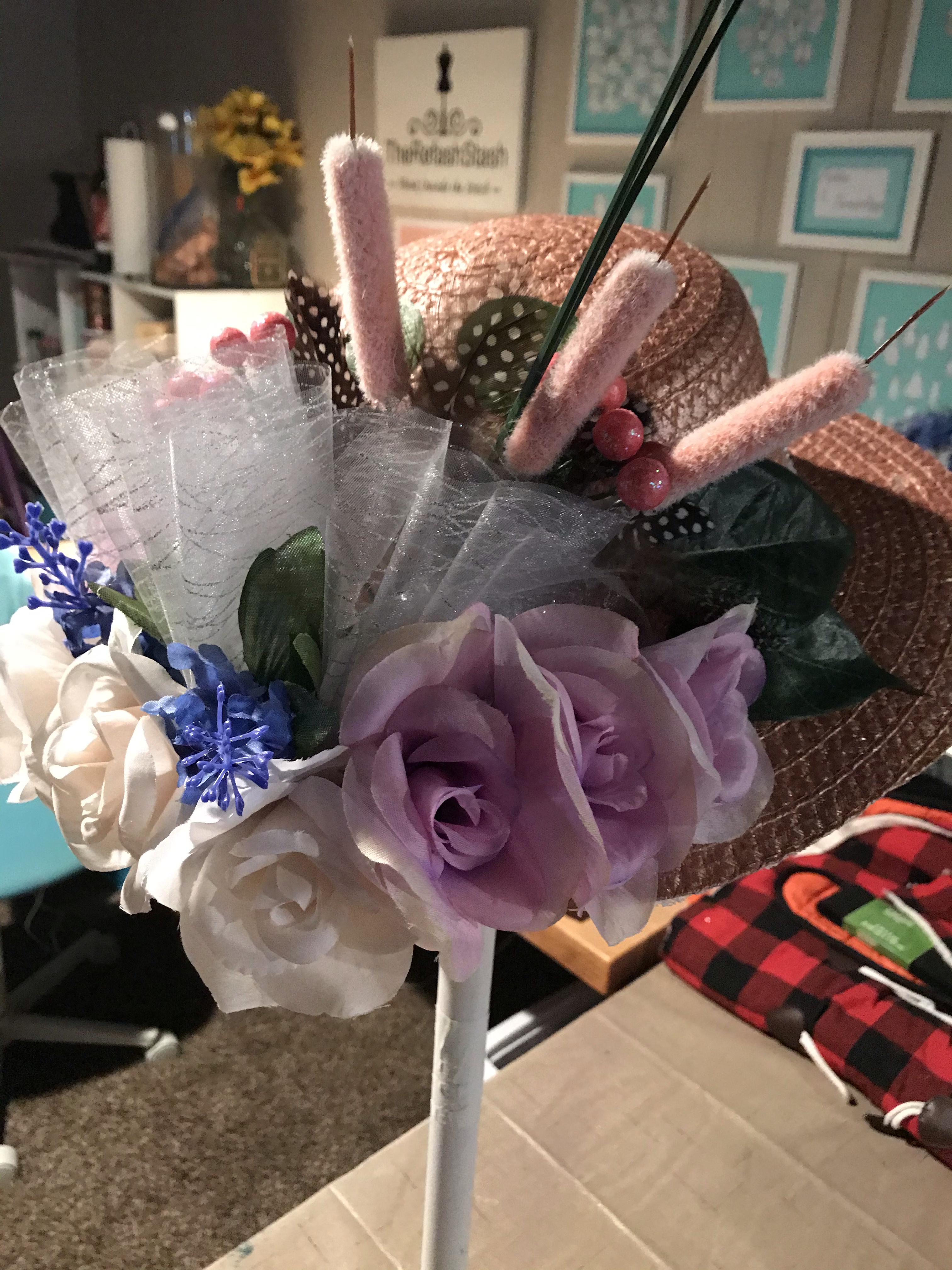 Hat—A flattened Jcrew floppy hat, crafting mat, wire springs from couch, thrifted flowers and hating binding and bow used from straw hat.