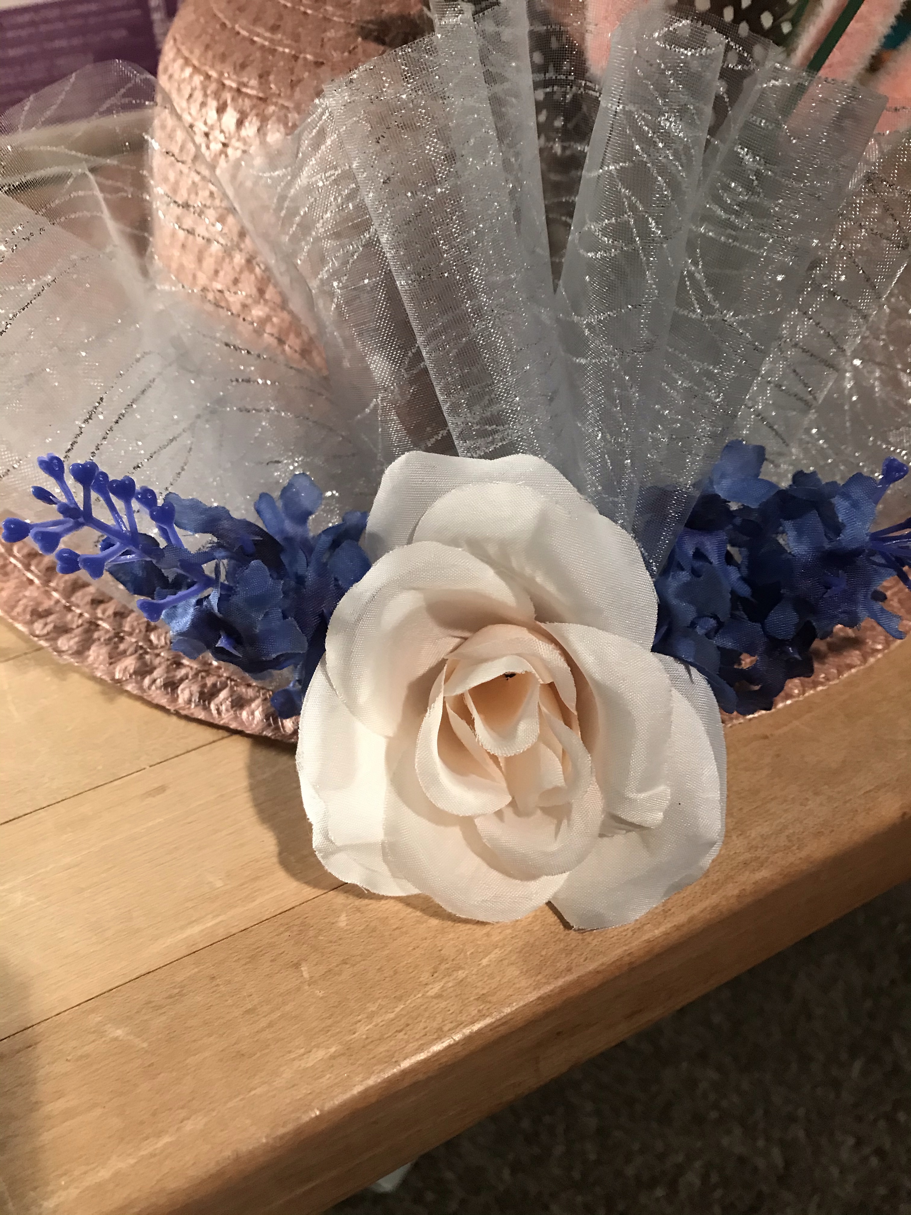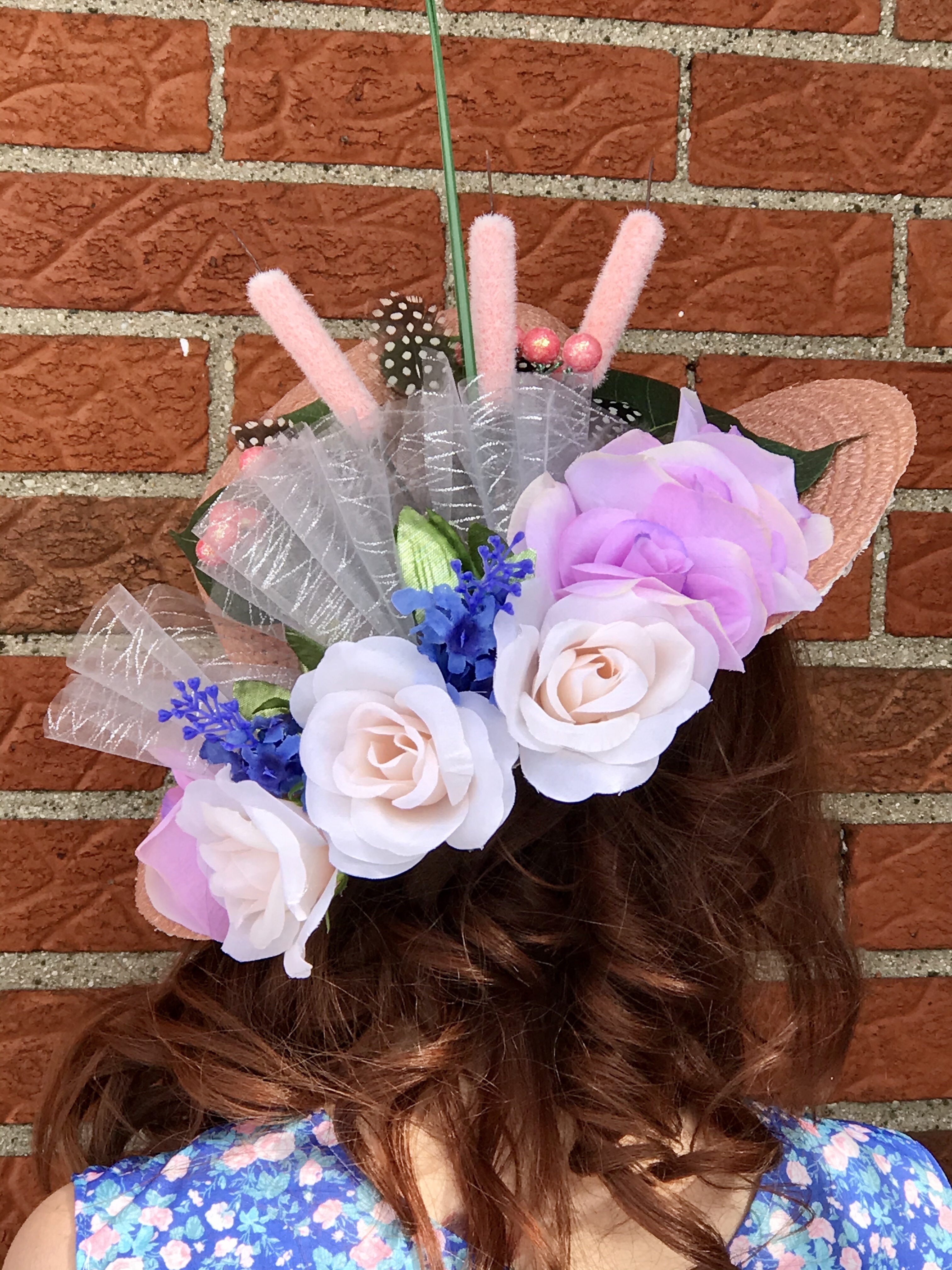 Lastly, I finished up adding the flowers and leaves. I always like to make my arrangements on the back of the hat.
