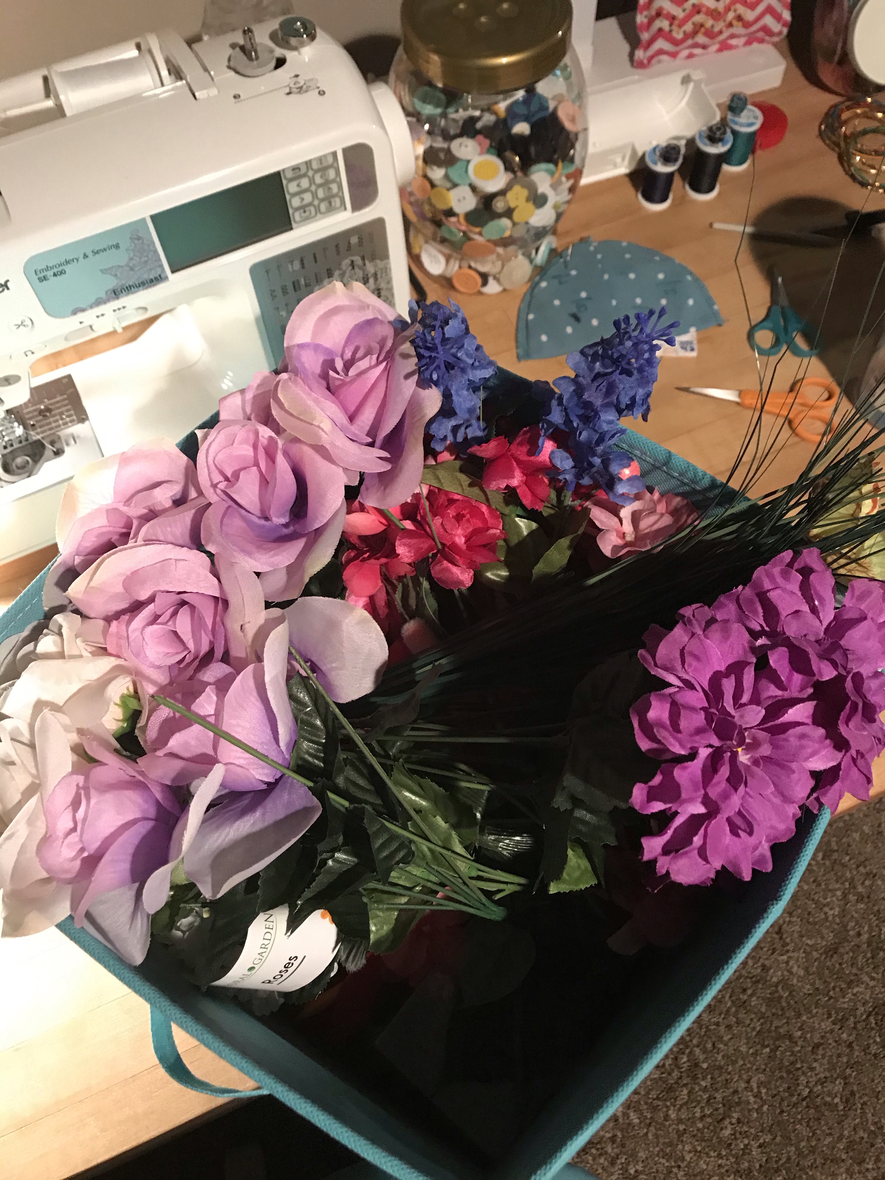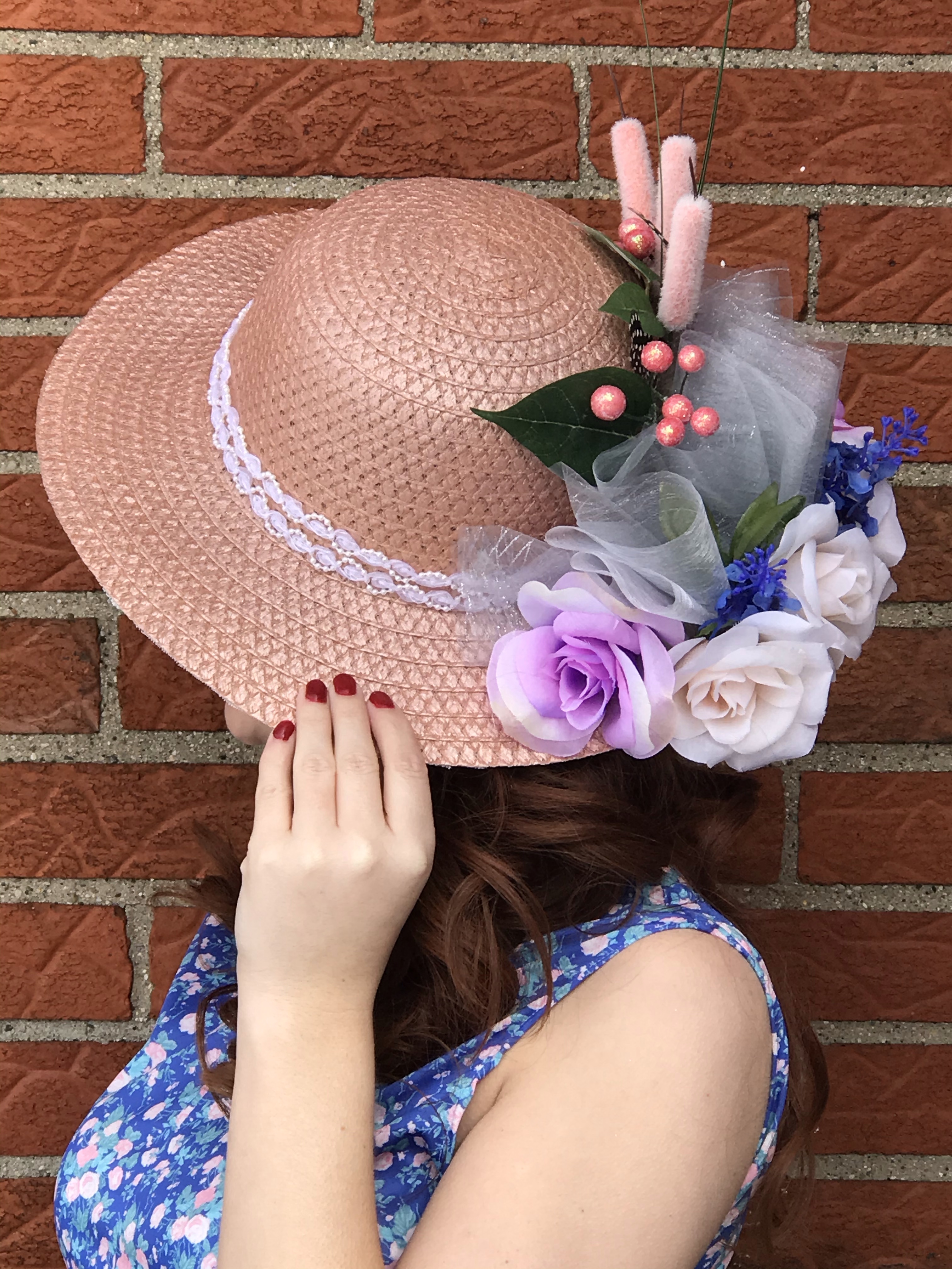 Over the years I have accumulated a basket FULL of faux flowers from Michaels, JoAnns, Hobby Lobby and even Dollar Tree! I took a look through my stash of faux flowers and found a few pieces that I think would tie my hat to my floral dress!