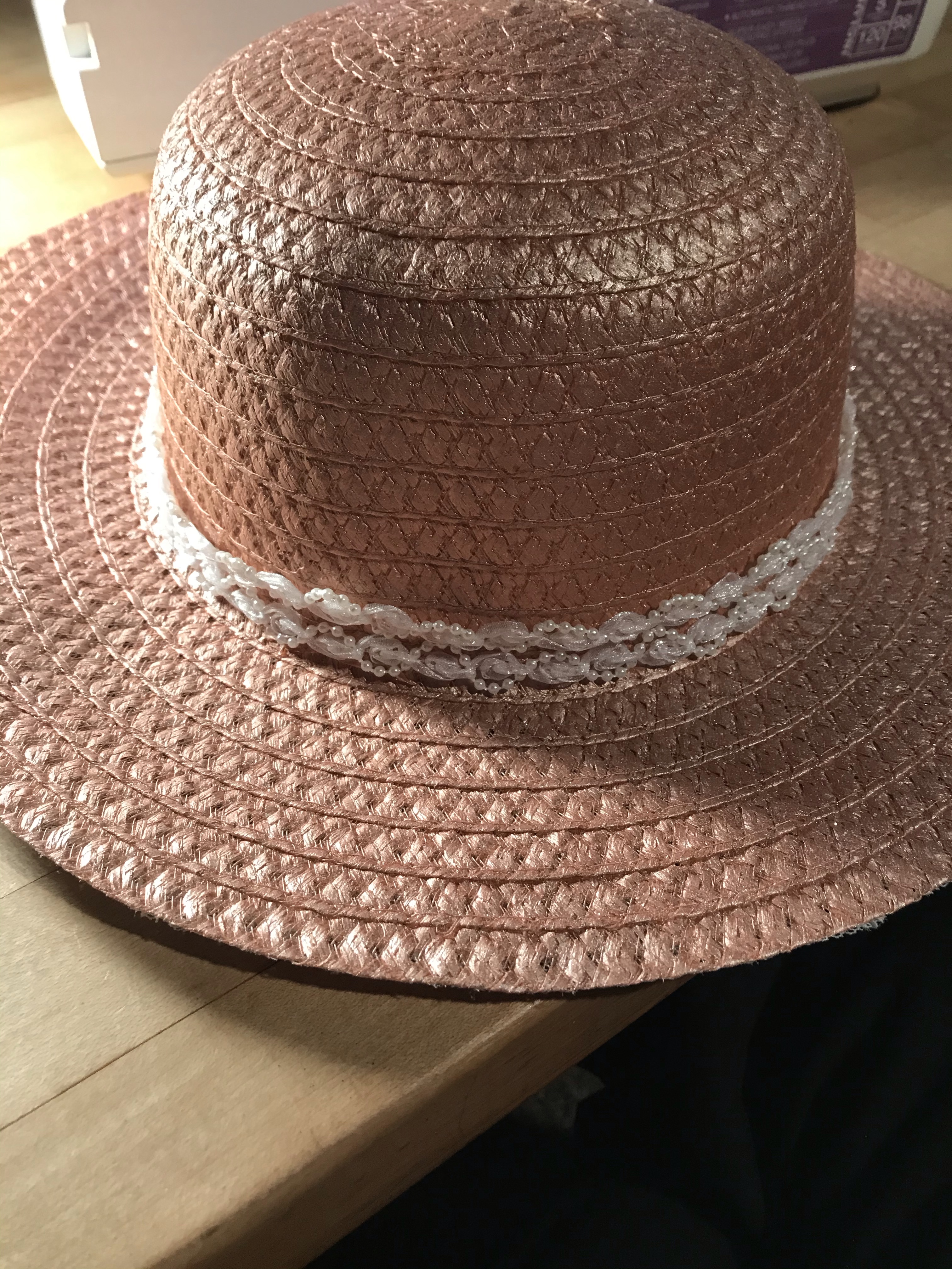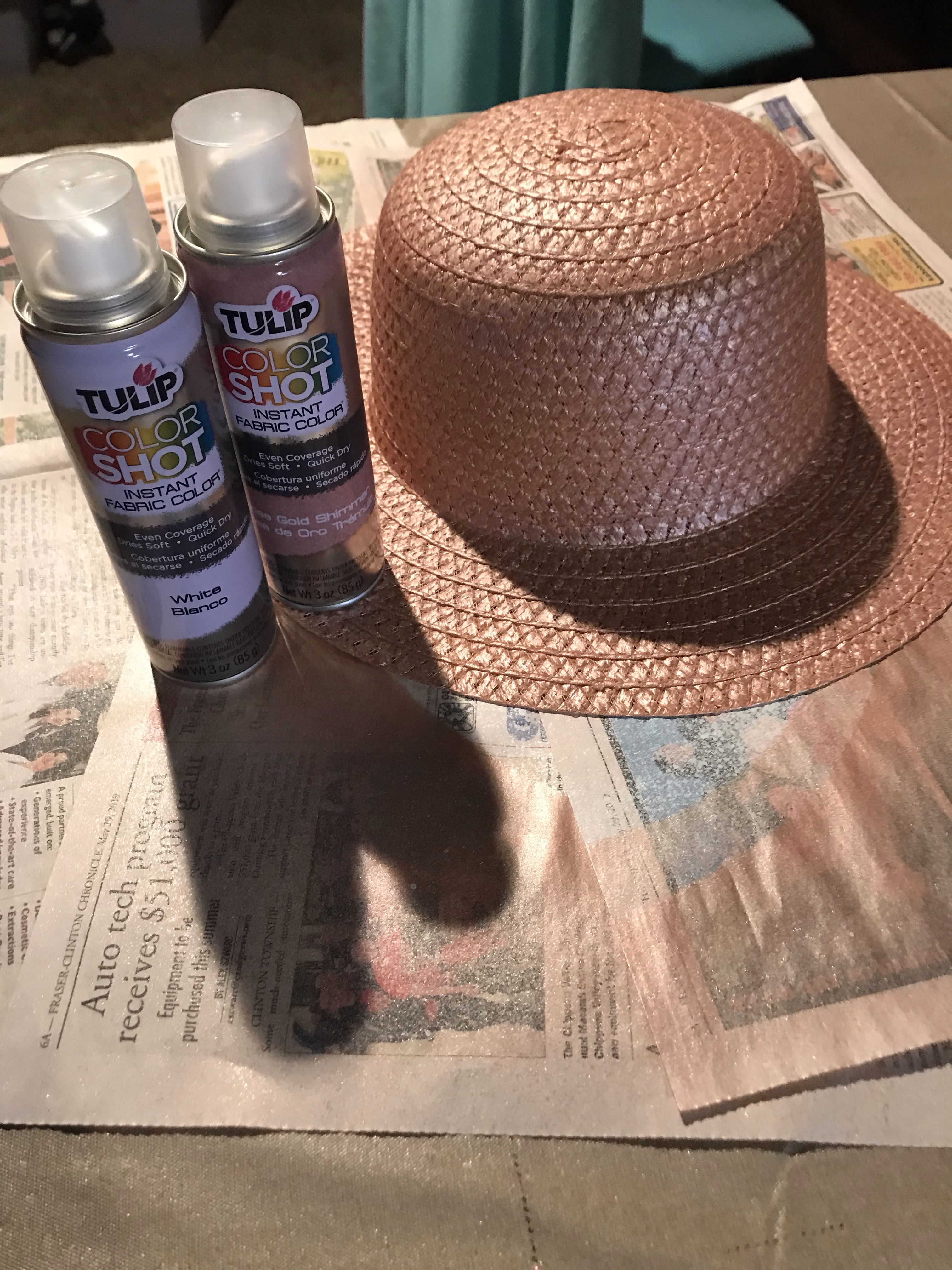 I grabbed some fabric spray paint (which is super fun to use) from JoAnn’s. I sprayed underneath the brim with the white paint and the whole outside with the rose gold paint (swoon!)