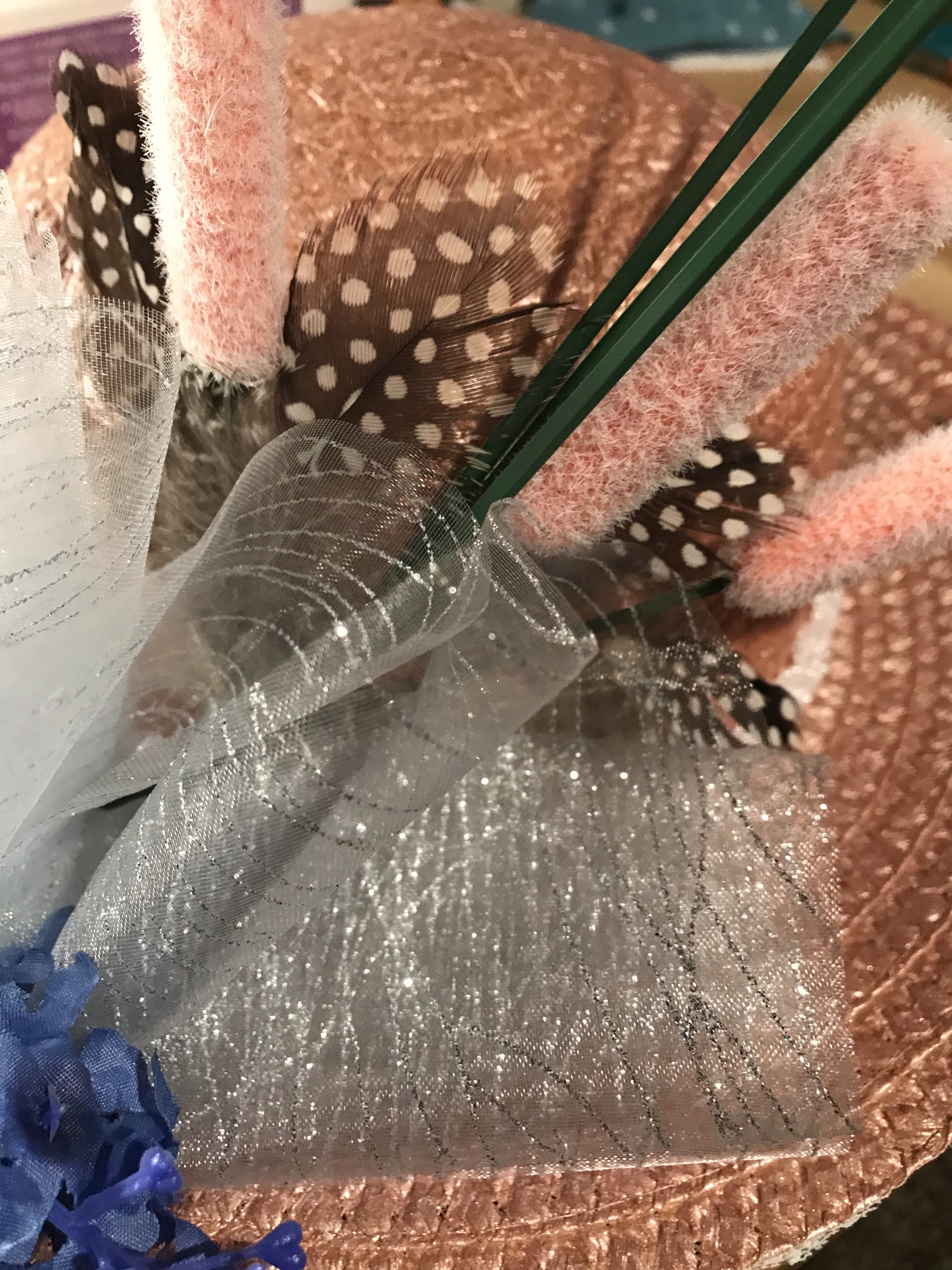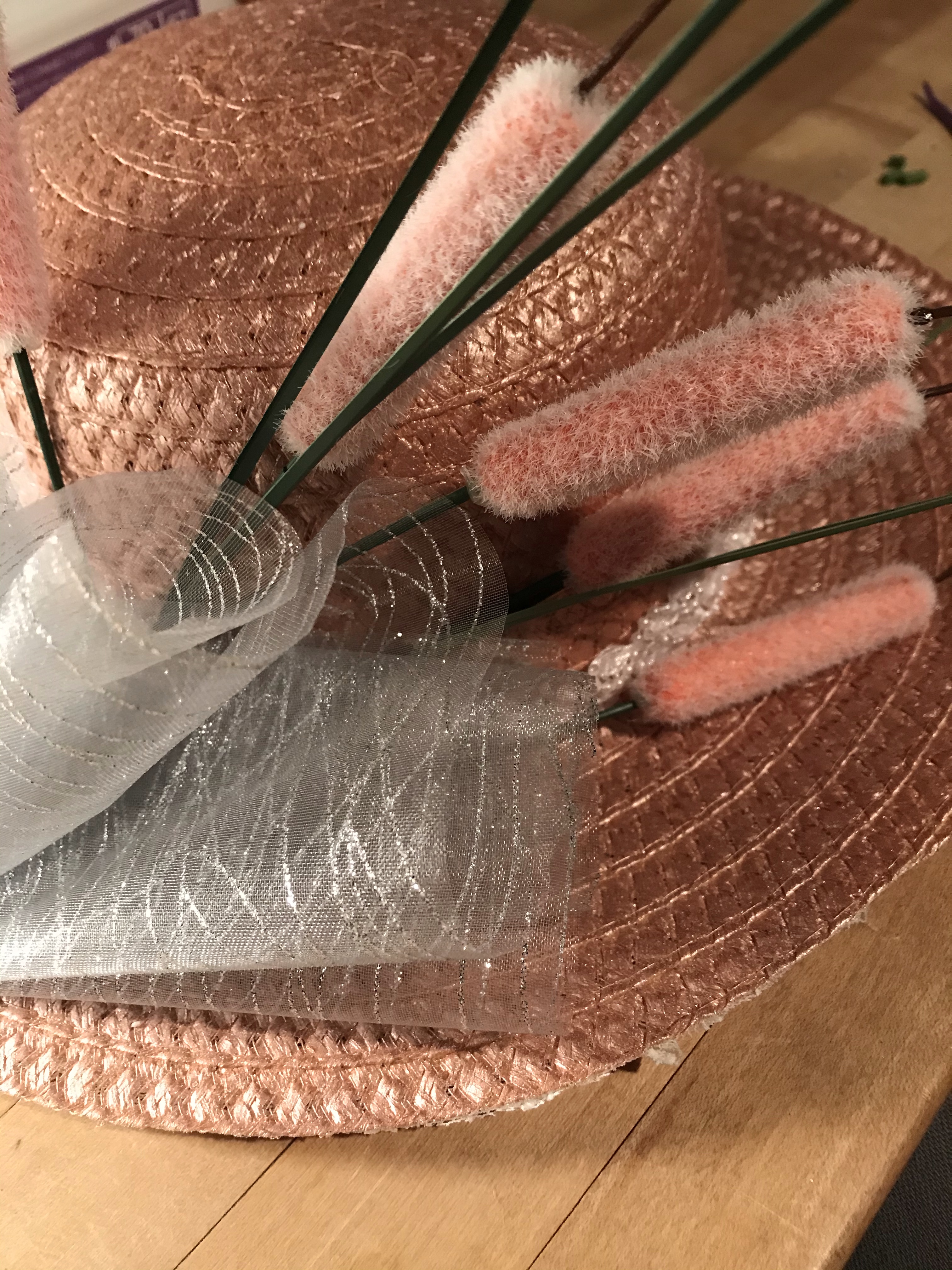 Now to fire up the hot glue gun! I began piecing my hat arrangement together. First some pink cattails and the silver sparkle tulle.