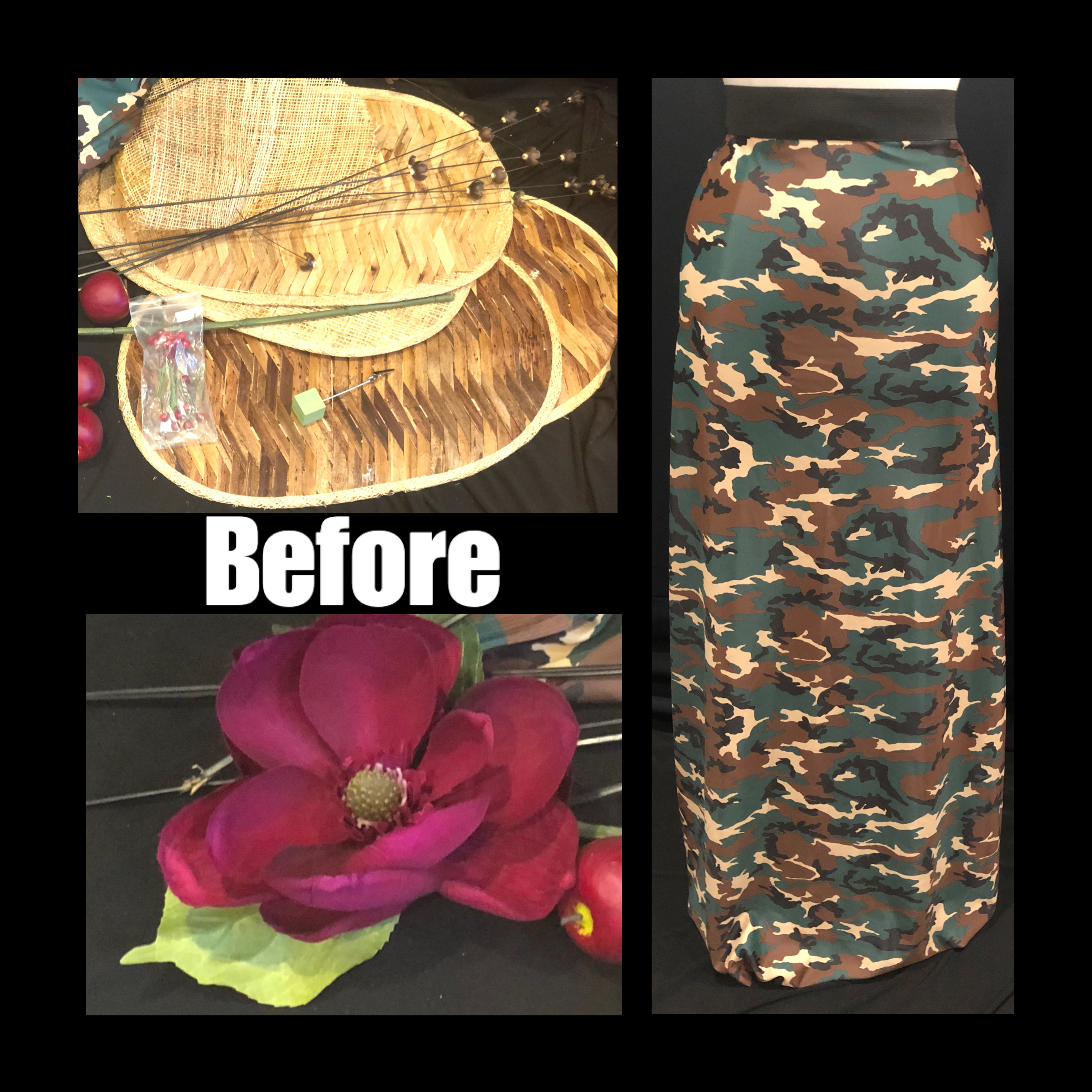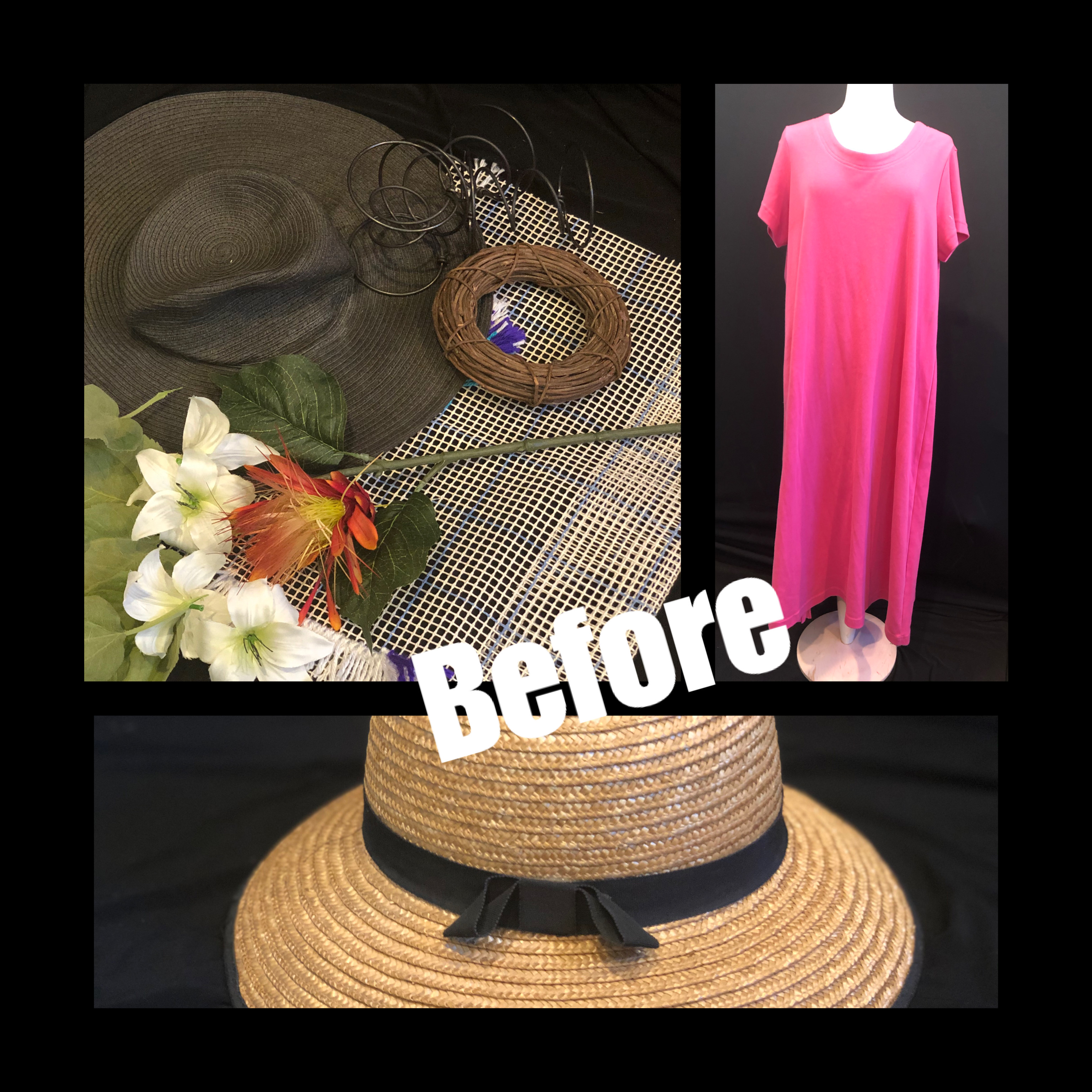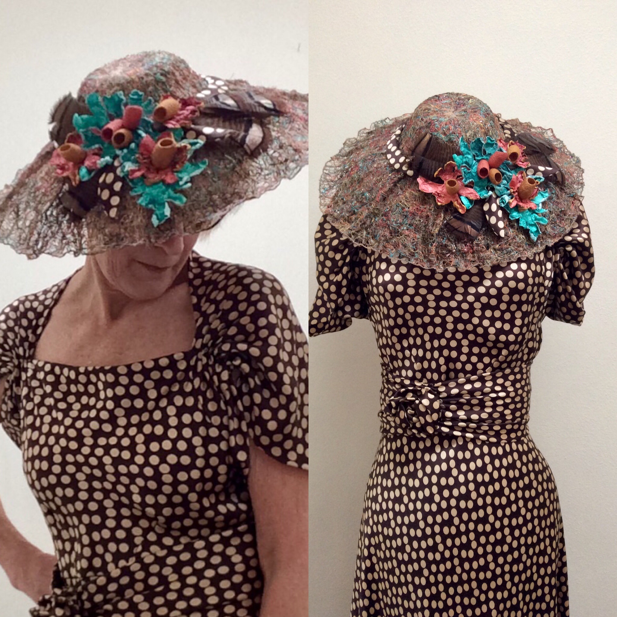 Hat- straw salad bowl, placemats, random flowers, couch springs, craft blocks and thrifted dress from an new IG follower in SLT.