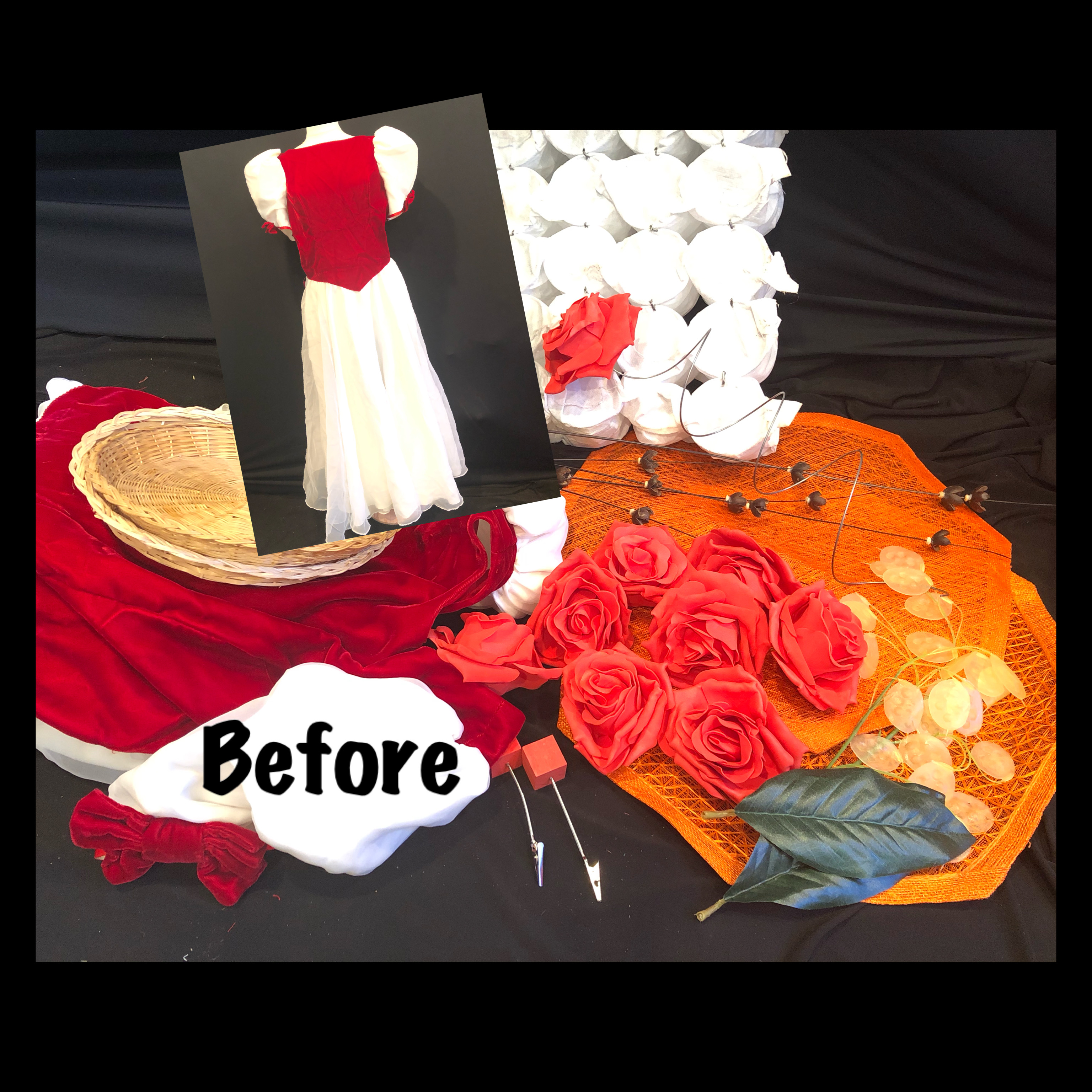 Hat- Anne of green gables basic straw hat, wire wreath, craft blocks, styrofoam balls, random flowers, gift box cover and leftover fabric from dress