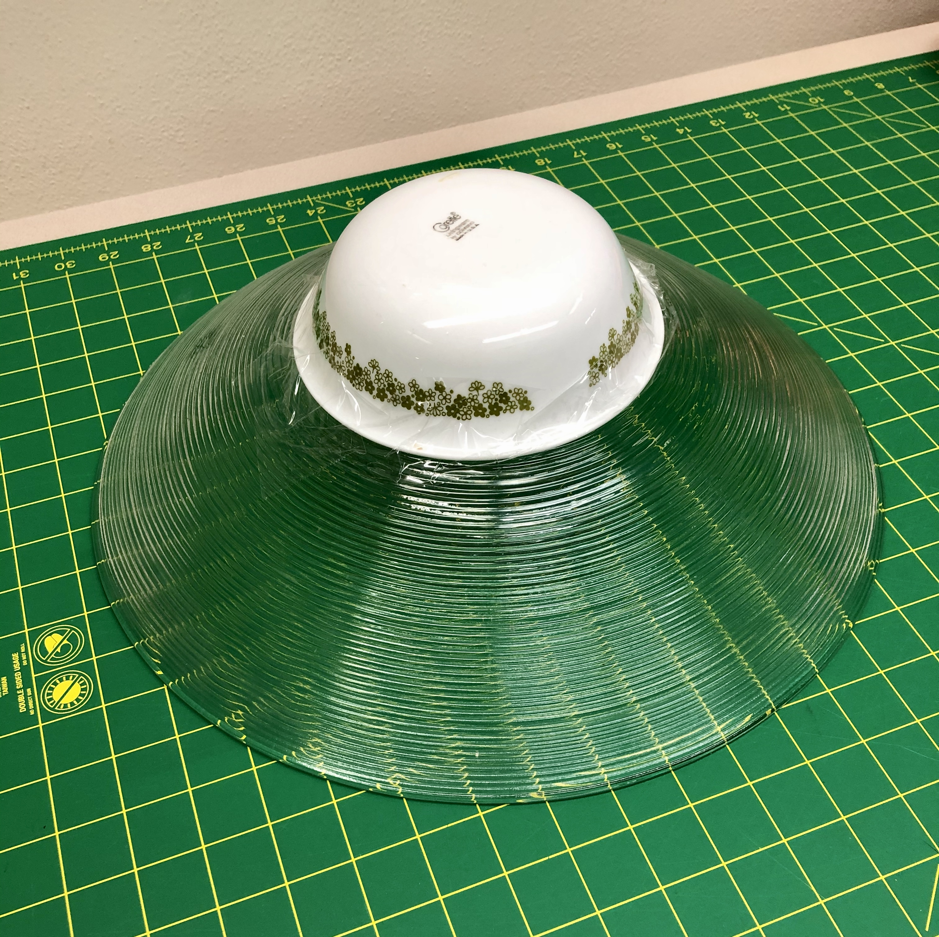 My makeshift hat block . . . A bird bath and bowl taped together.