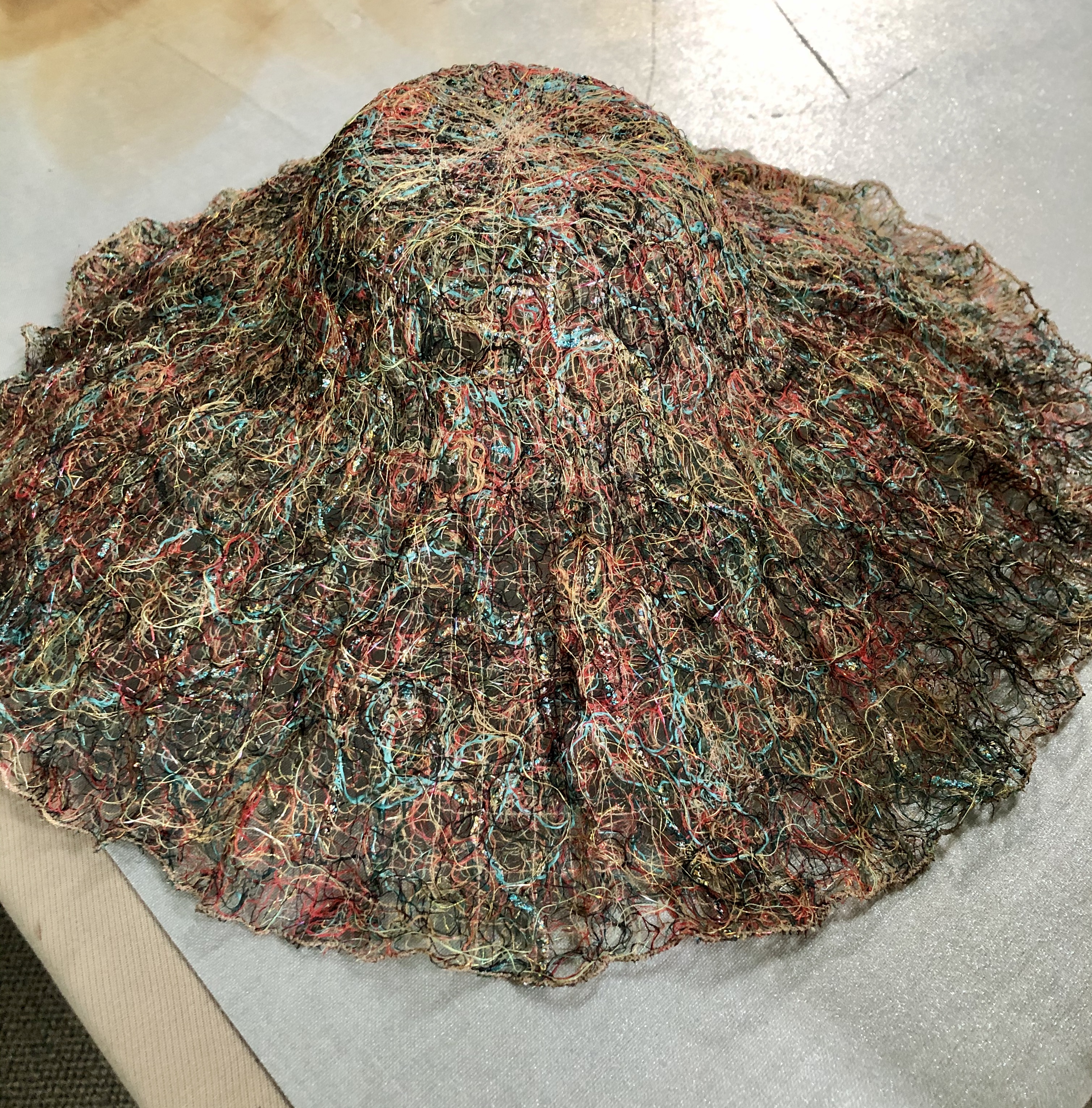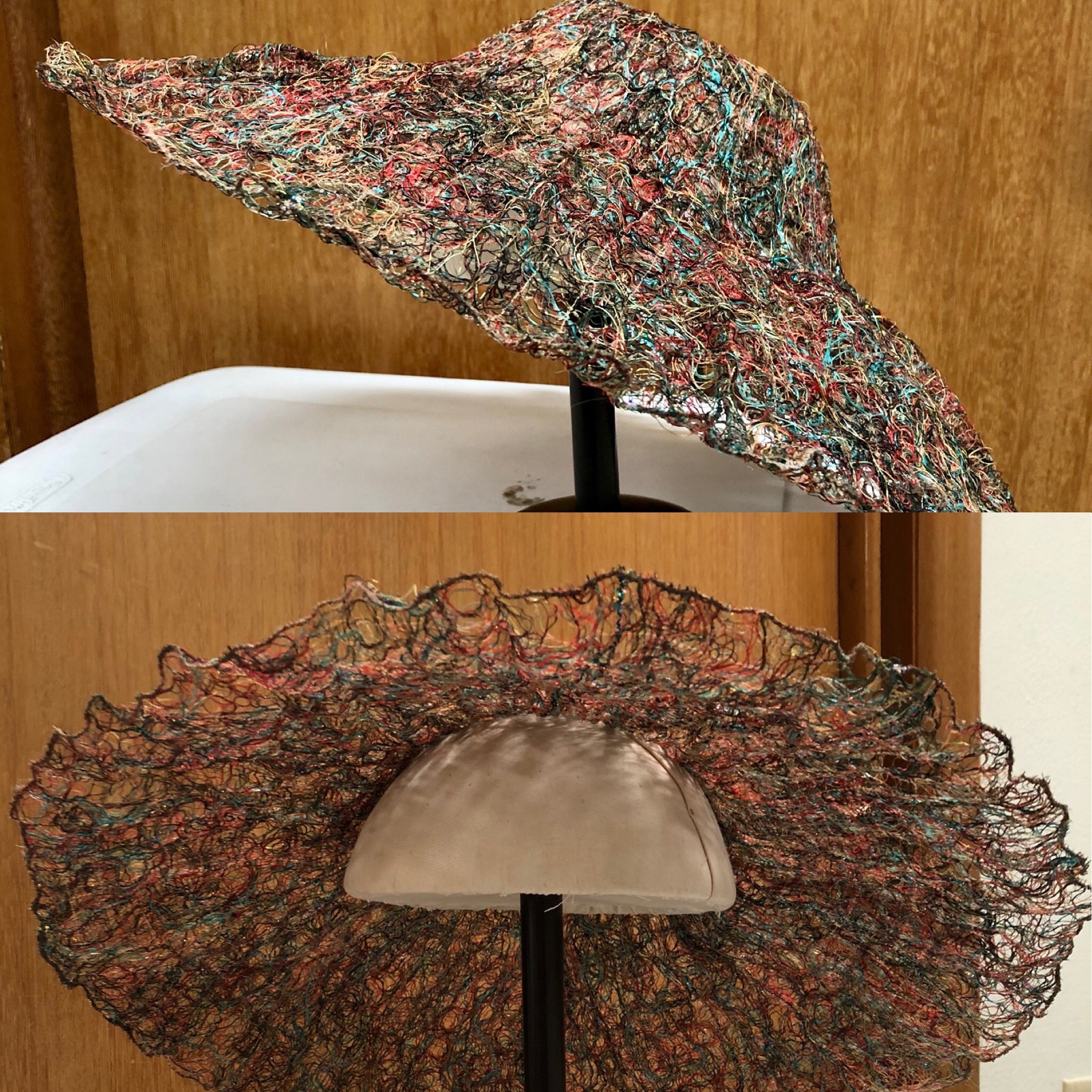 The wash away was partially rinsed out. The gooey threads were shaped on the “hat block” to dry.