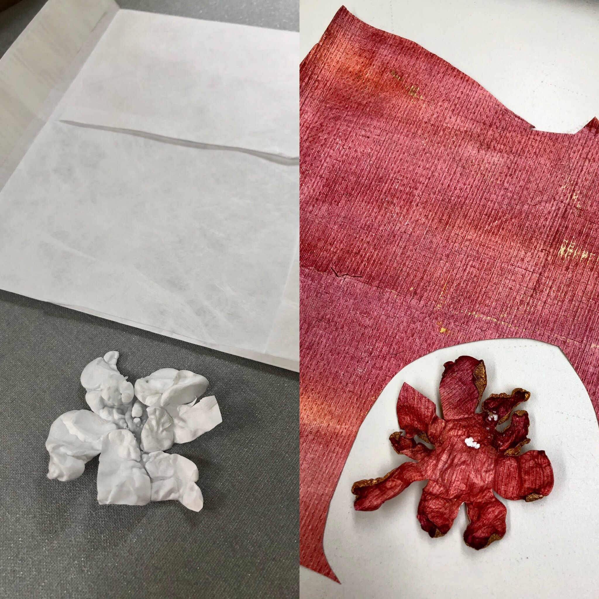 I painted a few tyvek mailers with acrylic paints, cut out large flower shapes and shrunk with my steam iron.